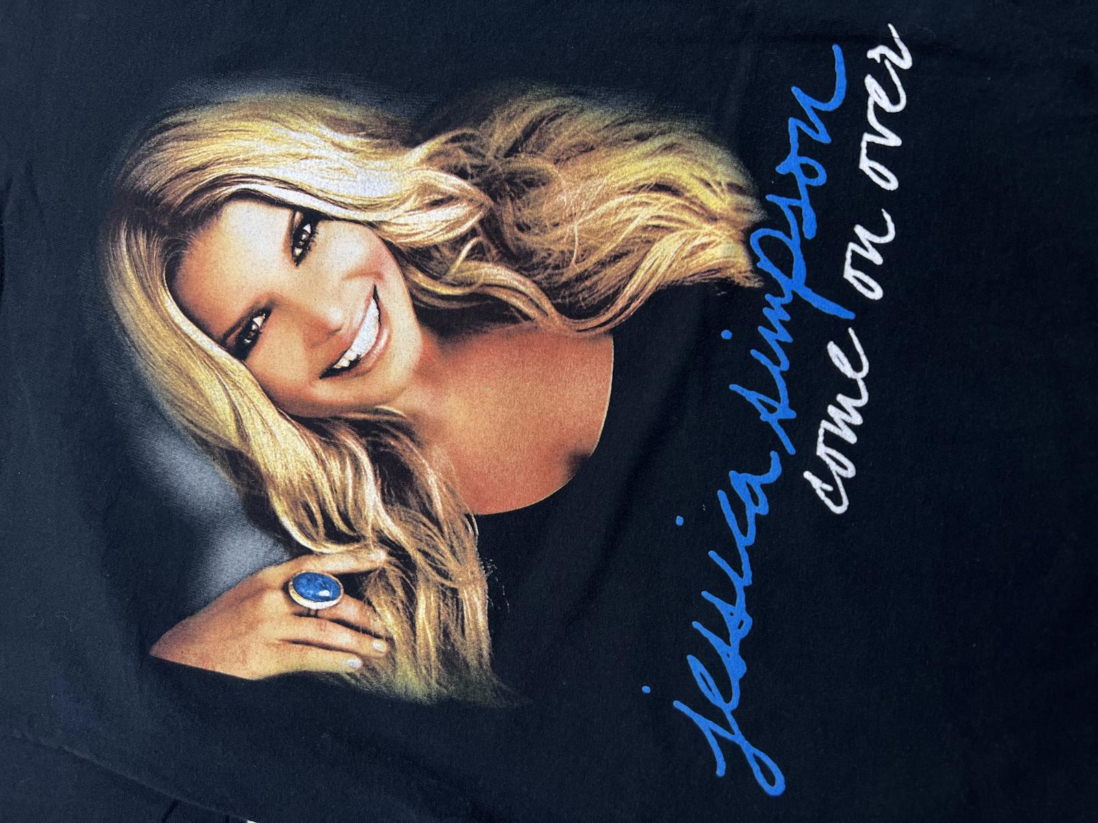 Black graphic t-shirt featuring a large, vibrant image of Jessica Simpson and the text 'come on over'.