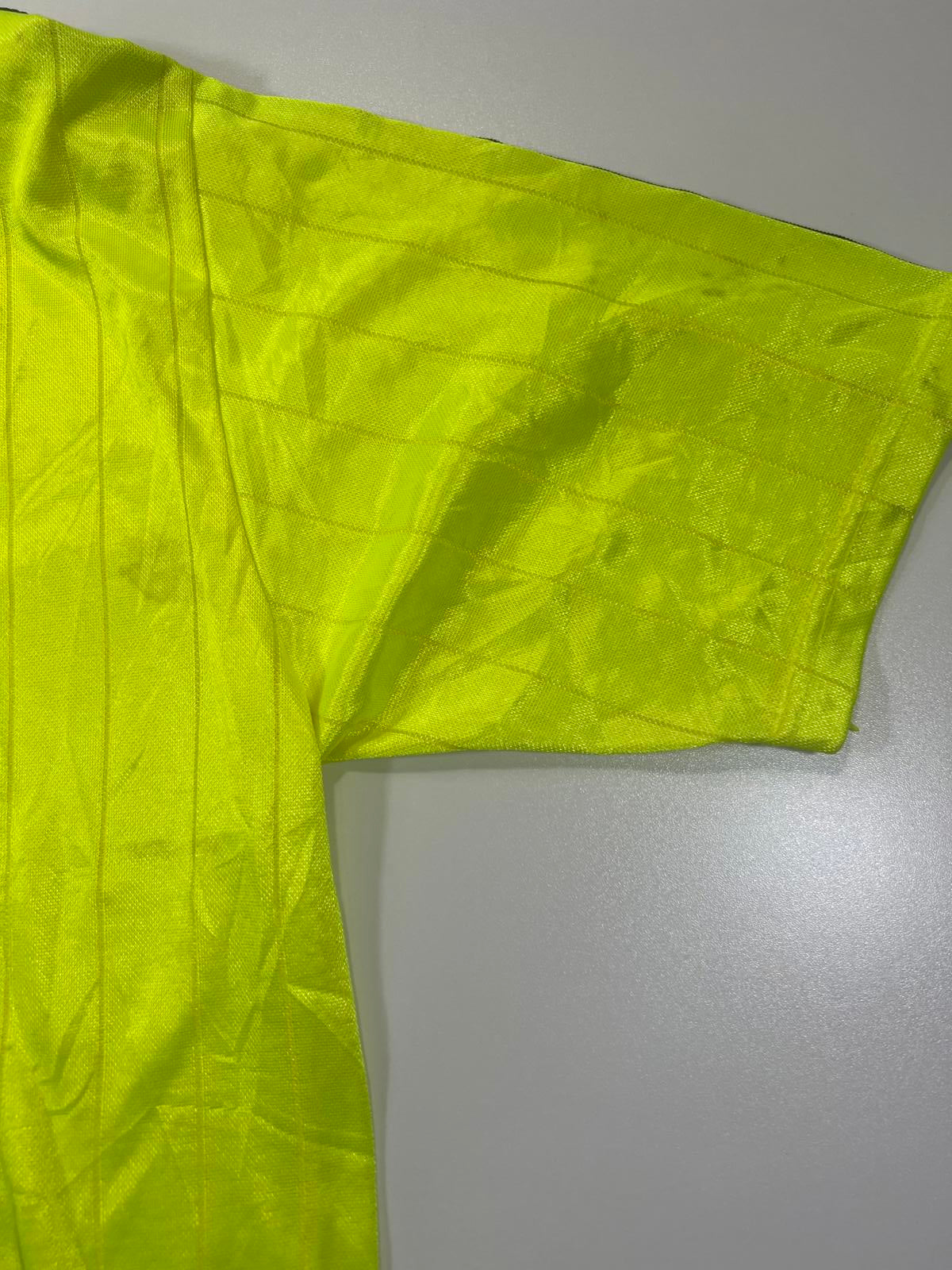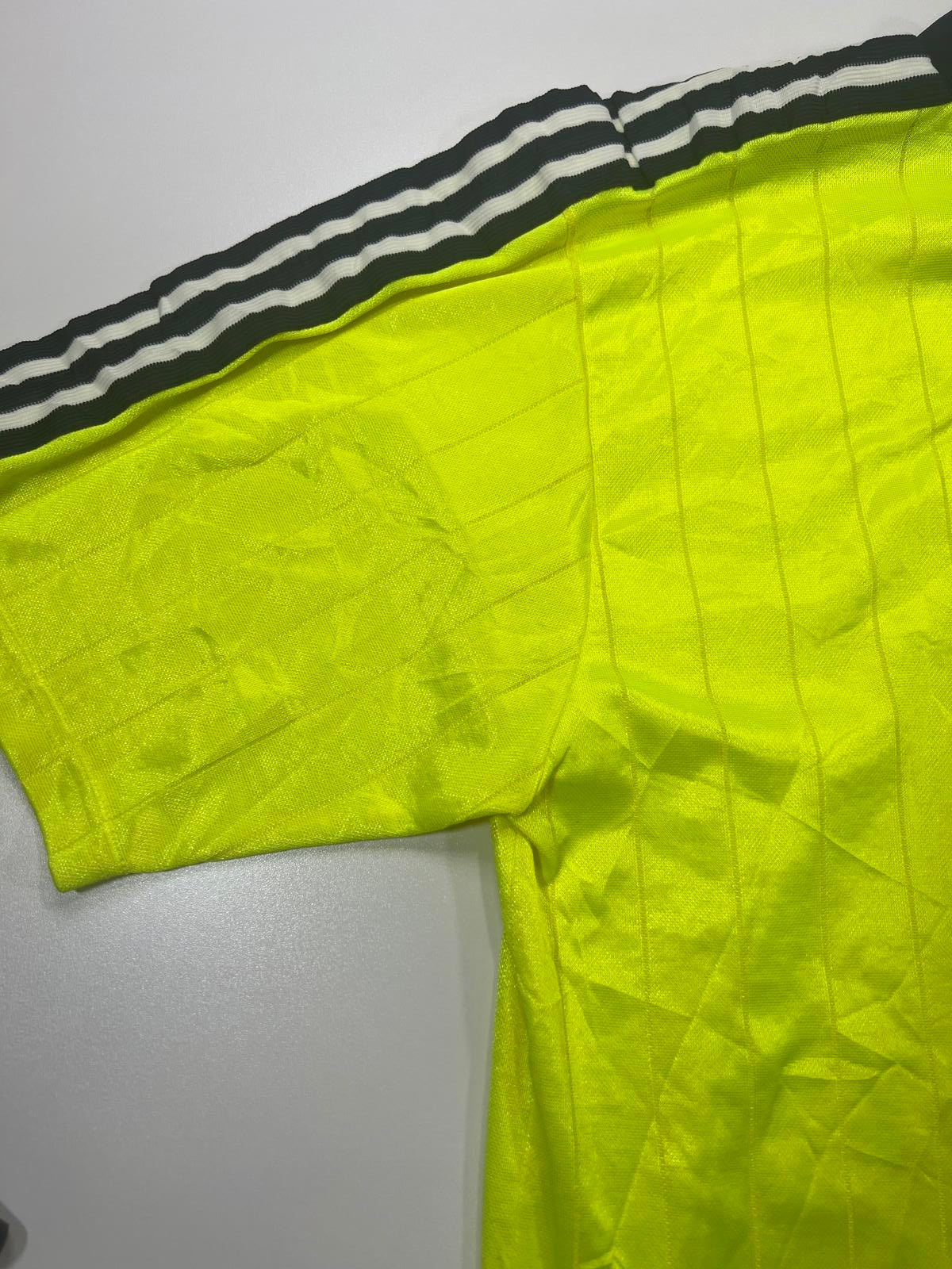 Vintage Adidas T-shirt in bright yellow with black collar and shoulder stripes.