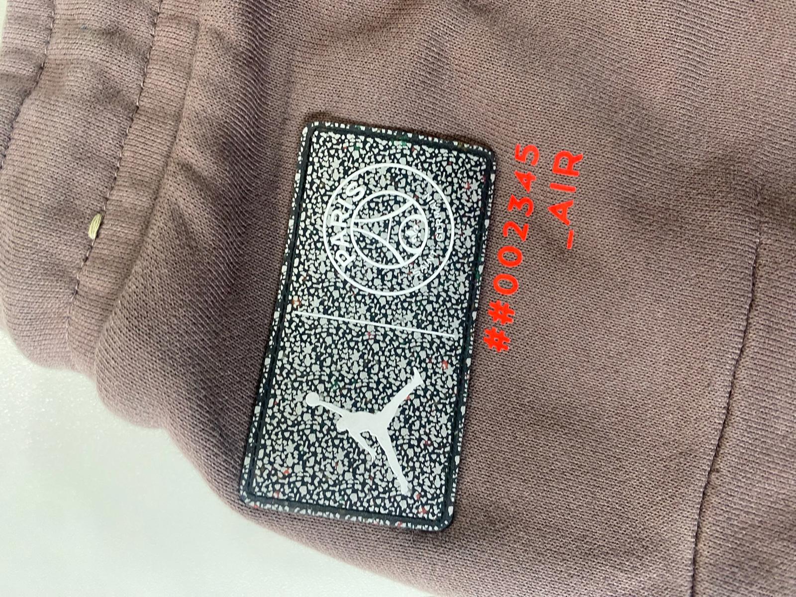 Brown jogger sweatpants featuring the word 'PARIS' printed in red on the left leg alongside the Jordan logo. Elastic waistband with drawstring for adjustable fit. Two black zippered pockets for secure storage. Ribbed cuffs at the ankles for a snug fit. Comfortable and stylish for casual wear or athletic activities.