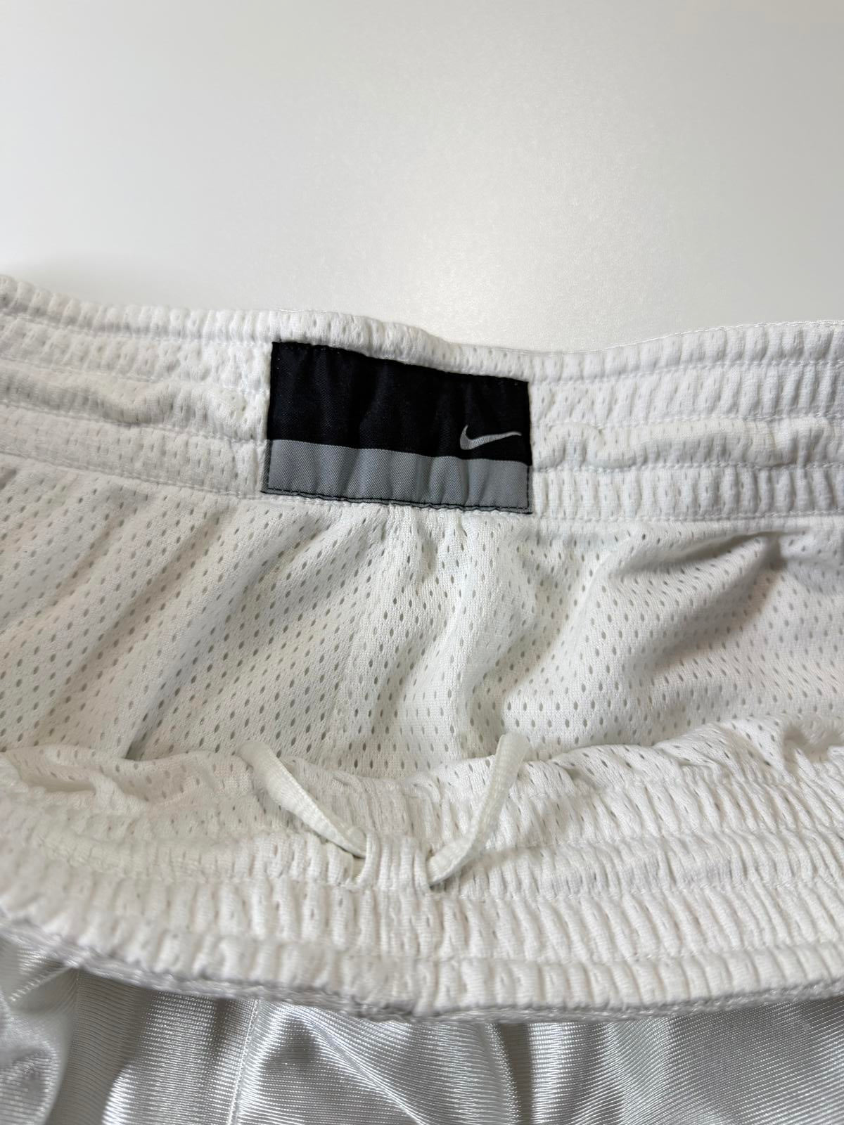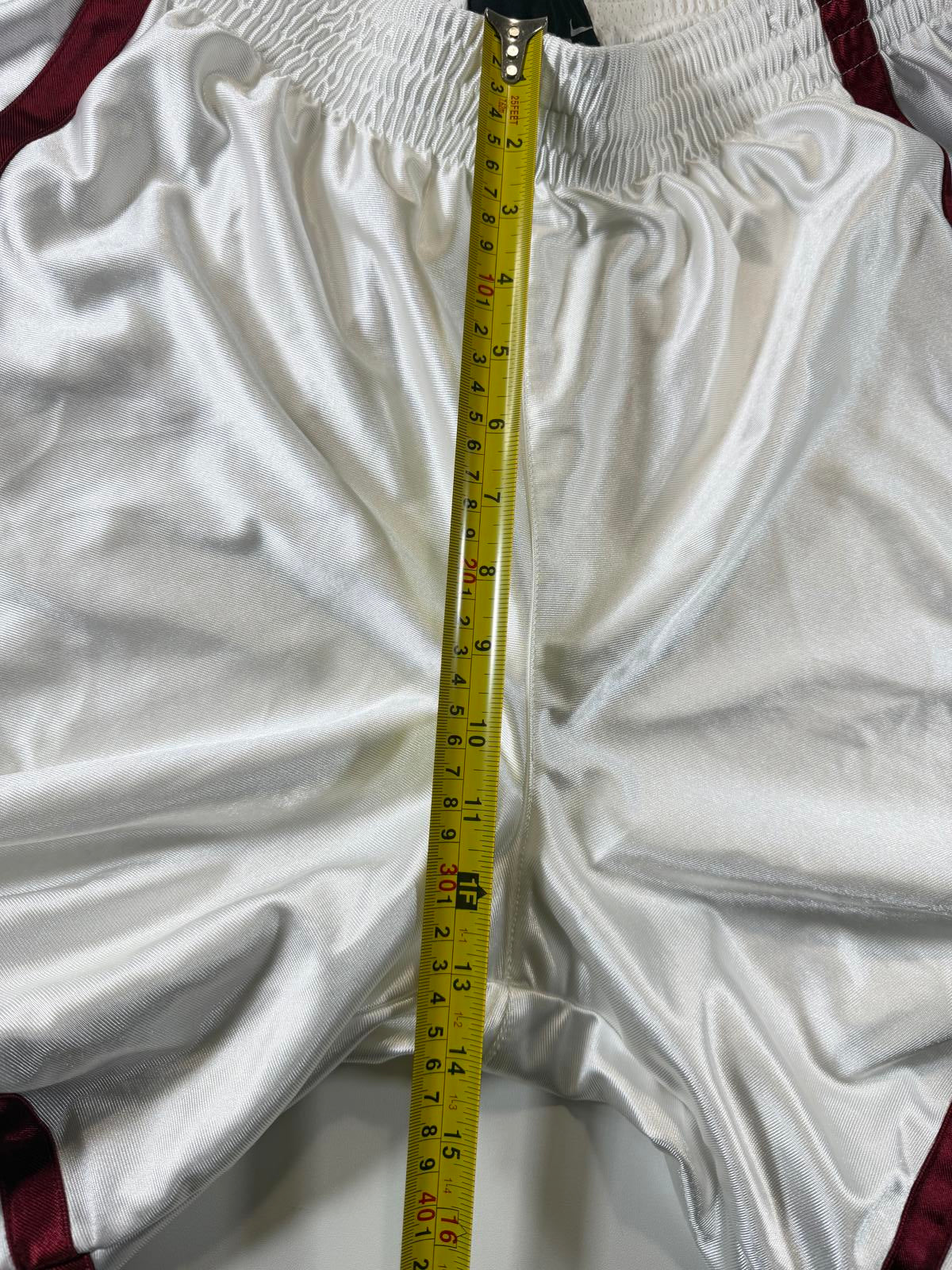 Nike athletic basketball shorts in white with burgundy trim. Features an elastic waistband for a comfortable fit and Nike swoosh logo on the left leg. Made from lightweight, breathable fabric ideal for sports and casual wear. Excellent condition with minimal signs of wear.