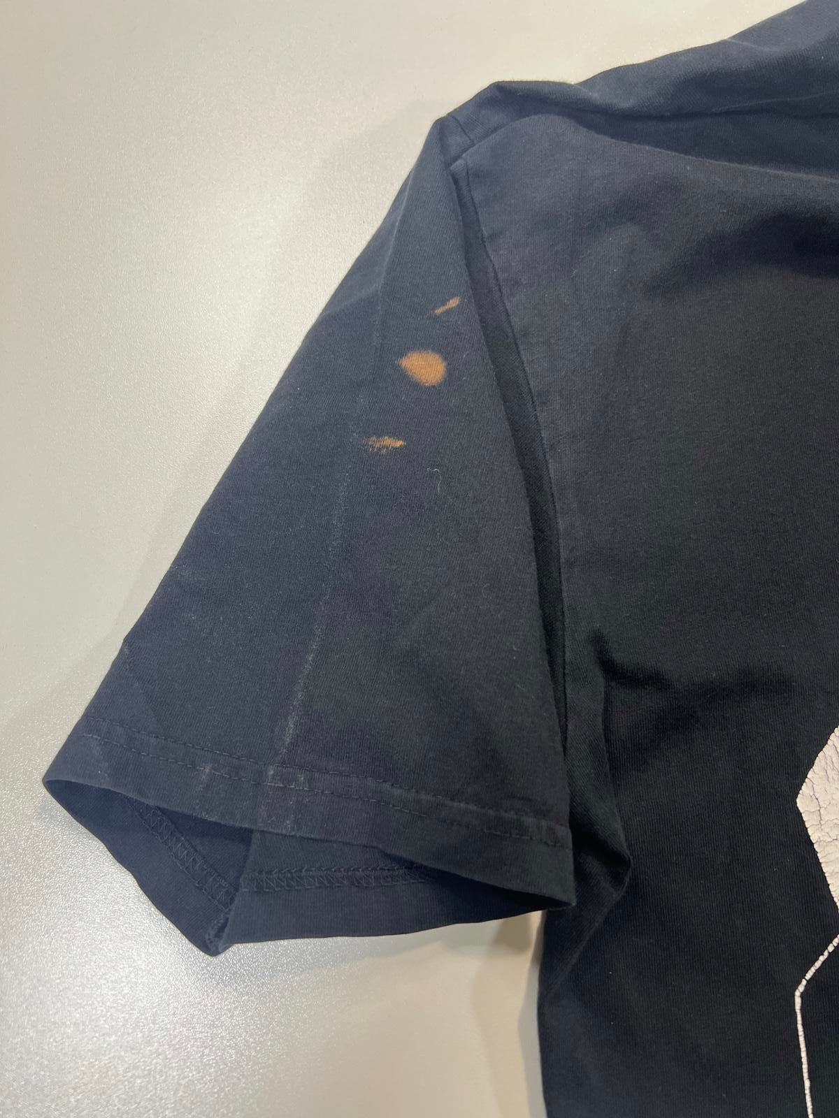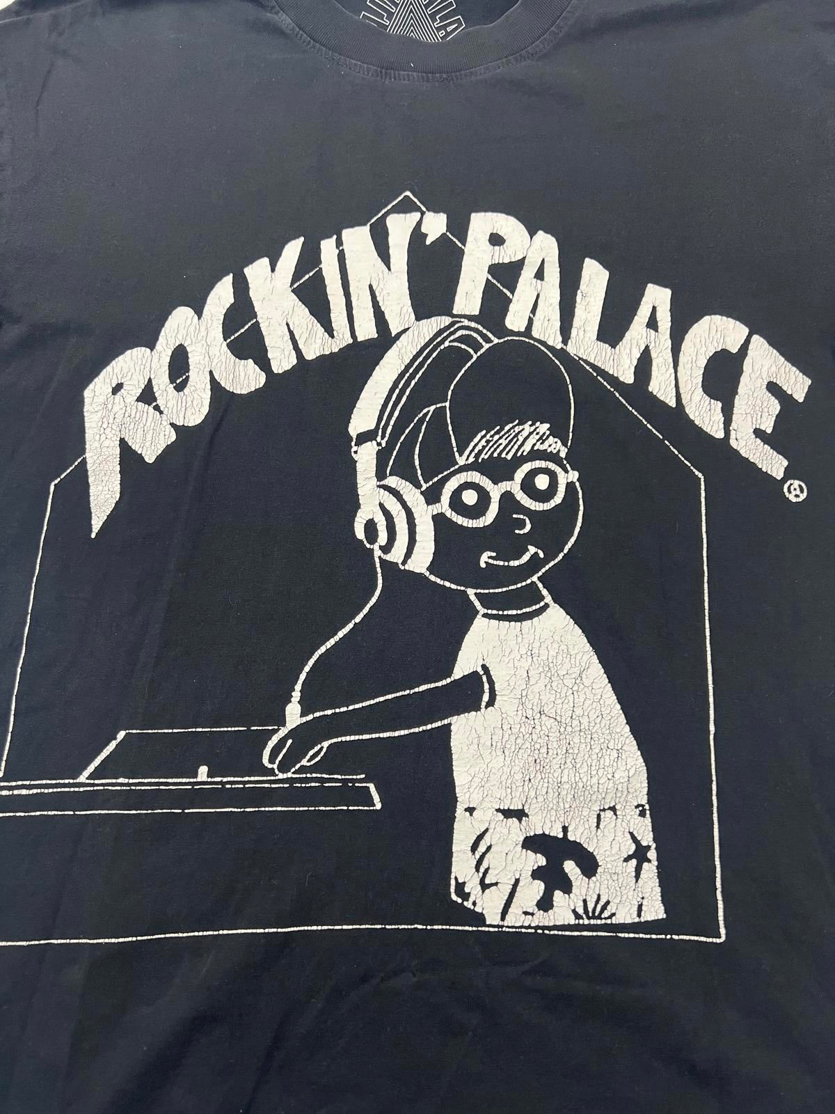 Black graphic T-shirt featuring a 'Rockin' Palace' design with a character wearing headphones.