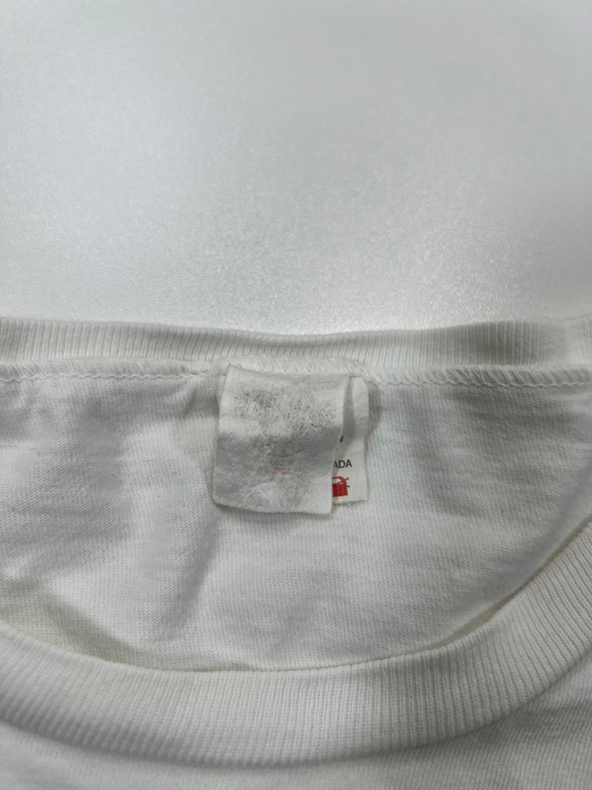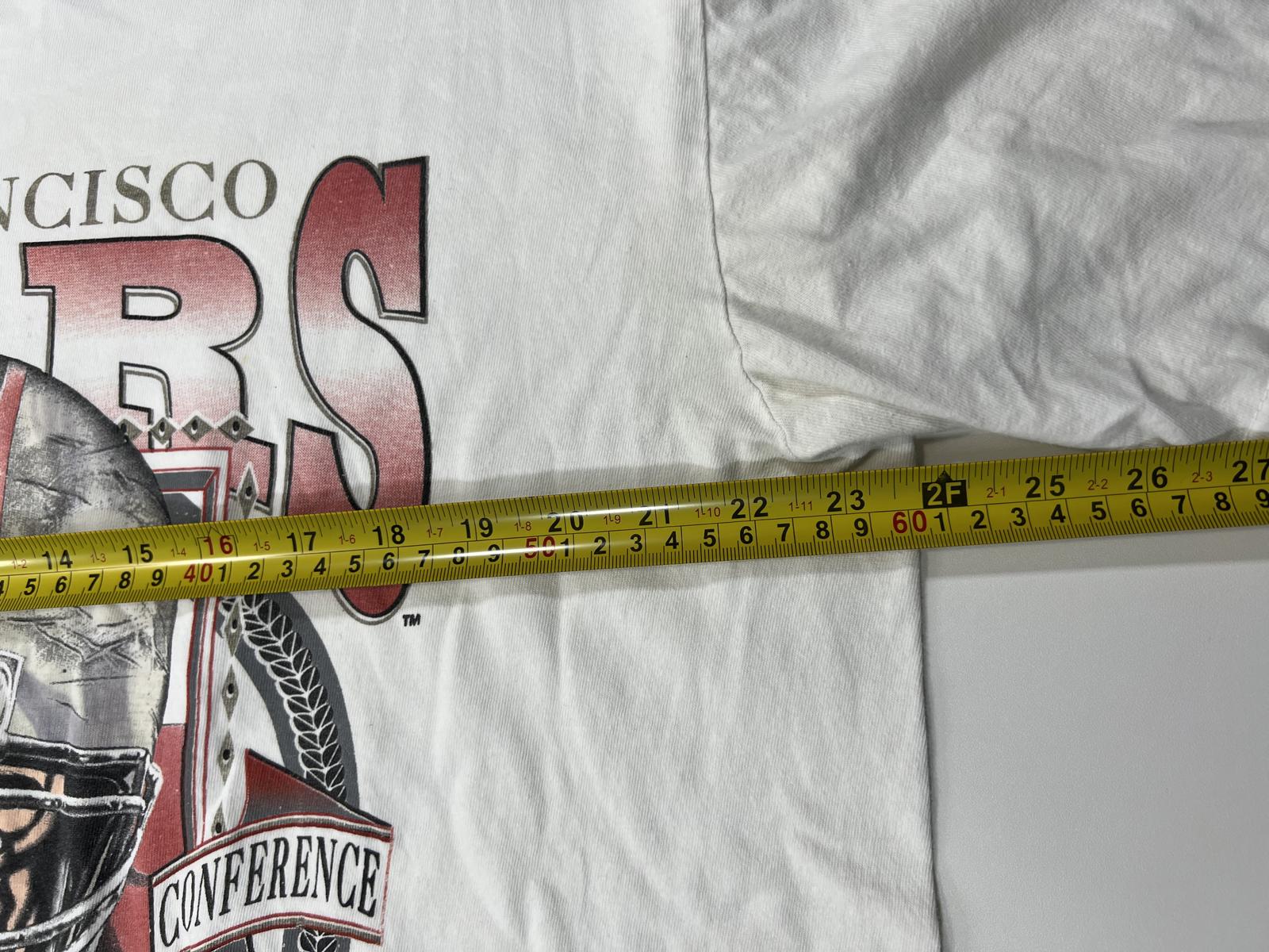 White vintage San Francisco 49ers T-shirt featuring a bold graphic of a football player and team logo.