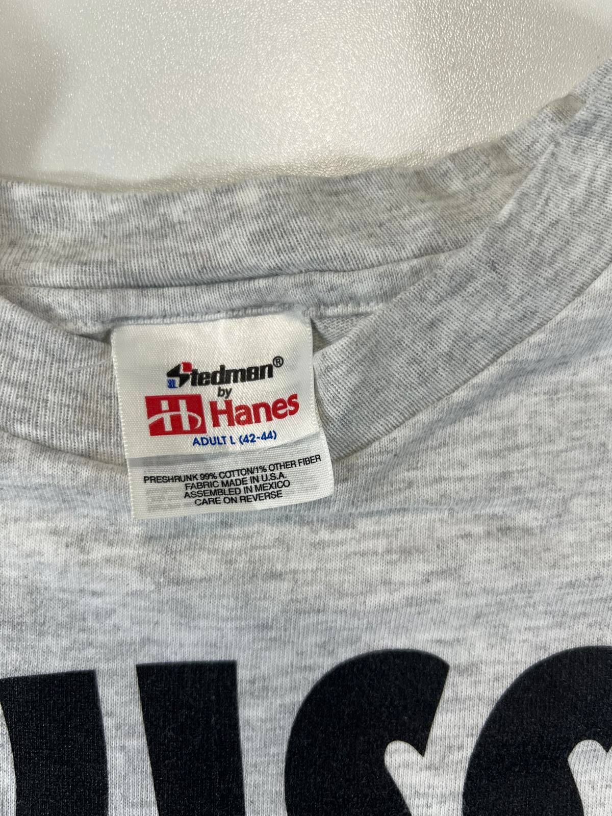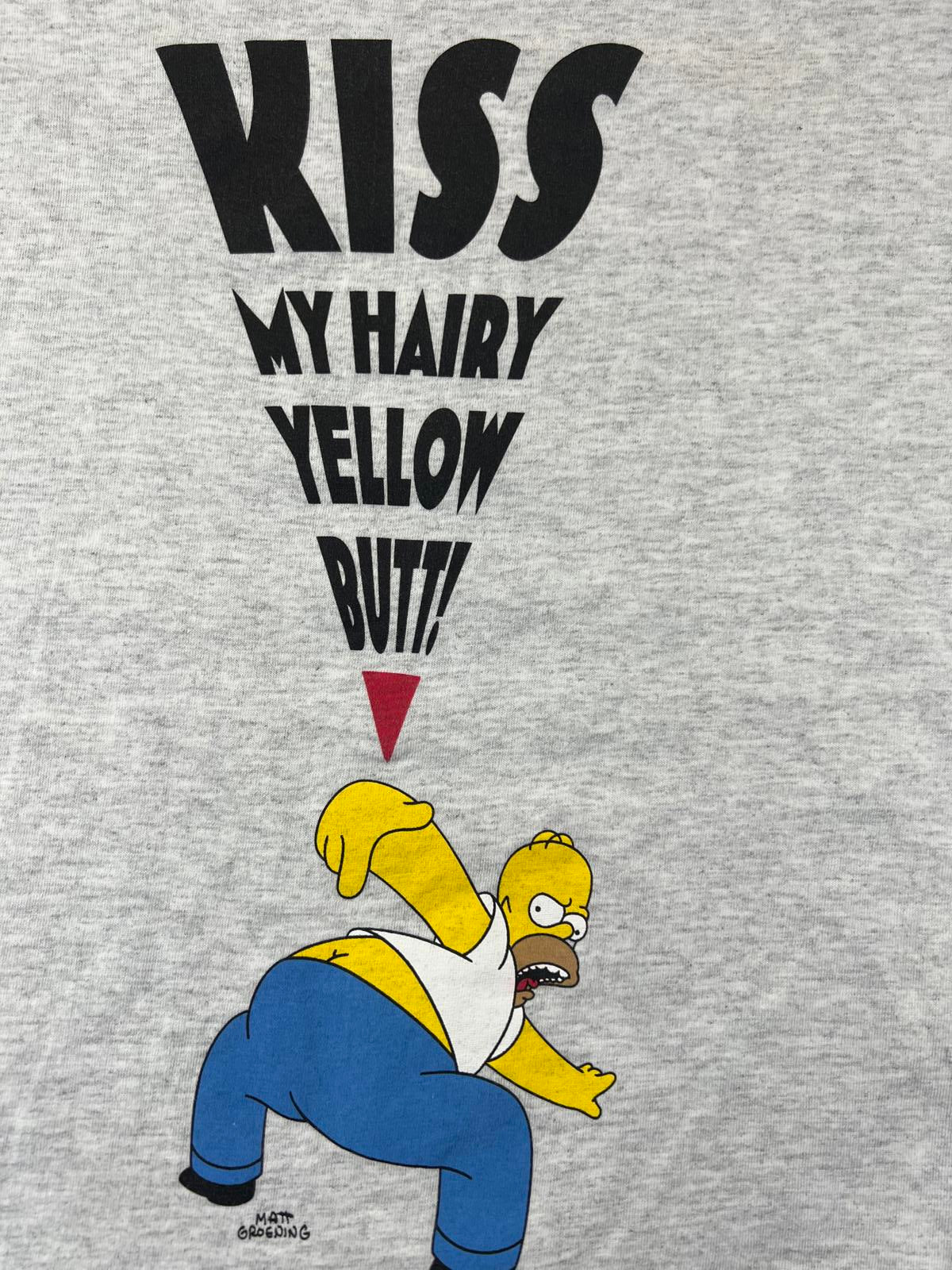 Vintage The Simpsons graphic t-shirt featuring Homer Simpson with the phrase 'Kiss My Hairy Yellow Butt!'. Made of soft cotton blend fabric in heather grey. Classic crew neck and short sleeves. Perfect for fans and collectors of The Simpsons memorabilia.