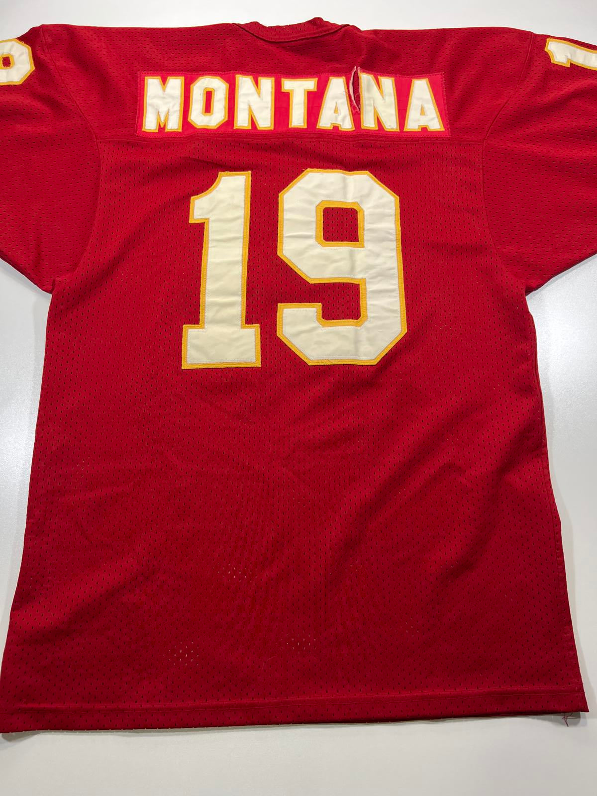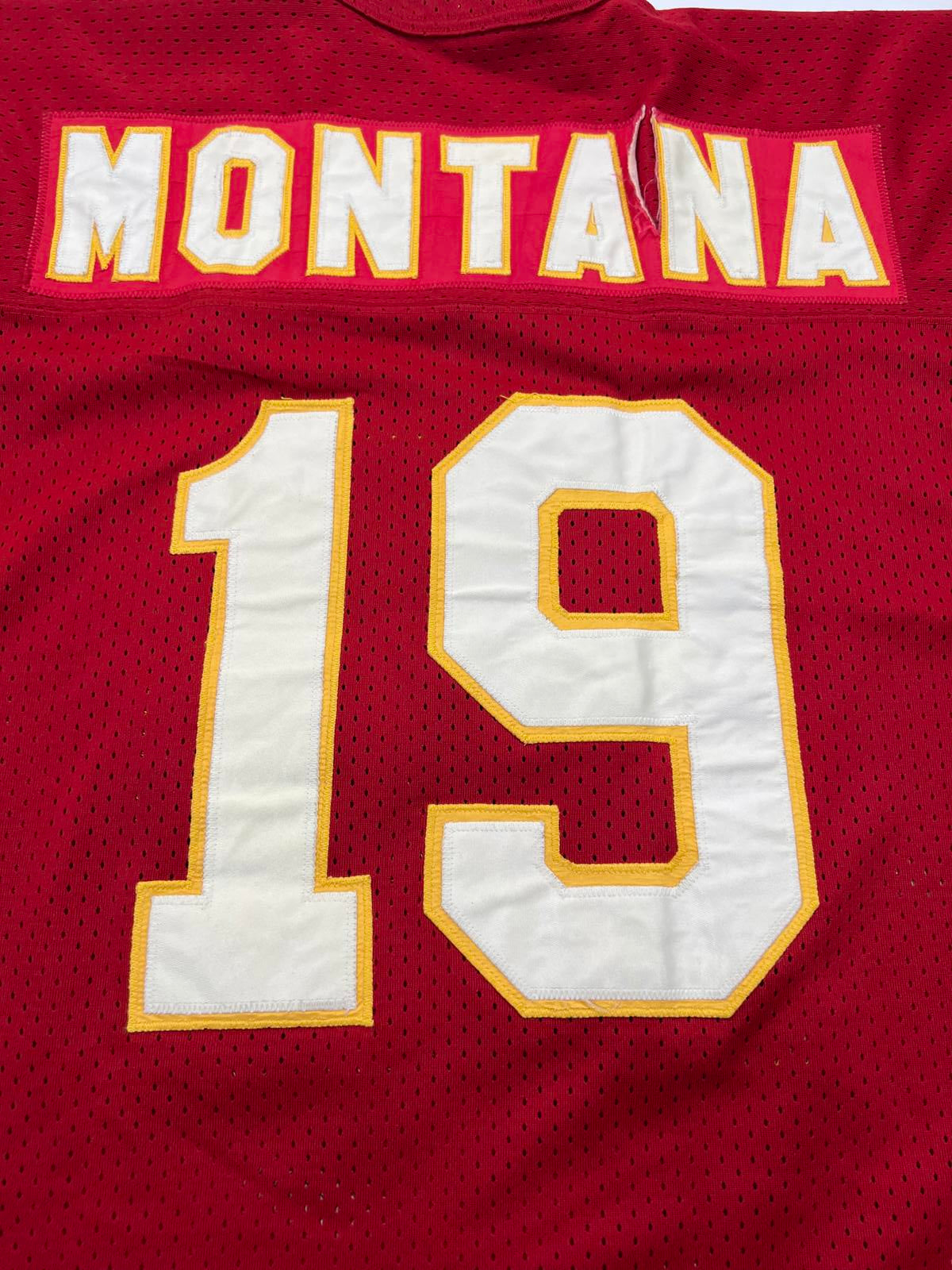 Vintage 49ers Joe Montana football jersey with number 19 on front and sleeves.