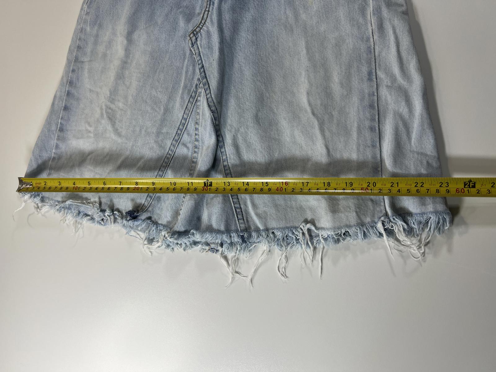 Vintage Levi’s custom Light blue denim skirt featuring a unique triangular seam detail on the front. The hem is frayed, adding a casual, worn-in look. Classic five-pocket design with belt loops and a button closure. Comfortable and versatile for everyday wear.