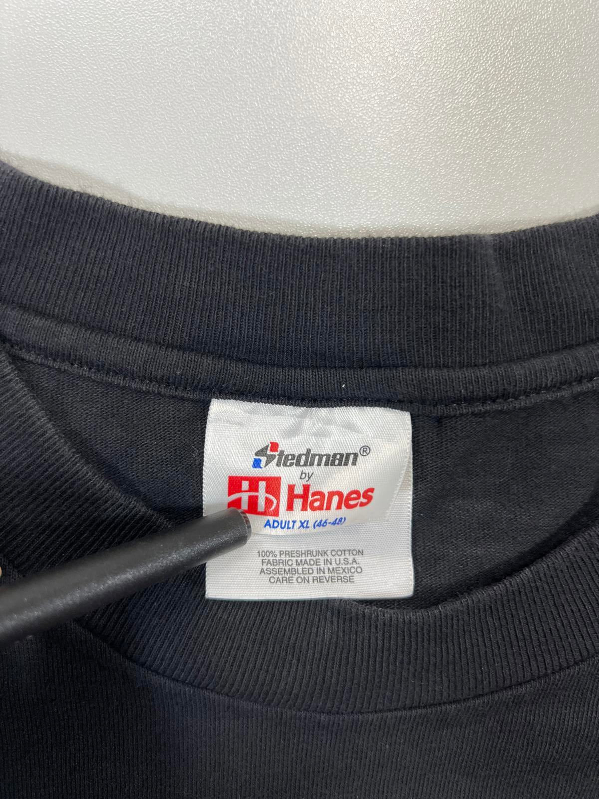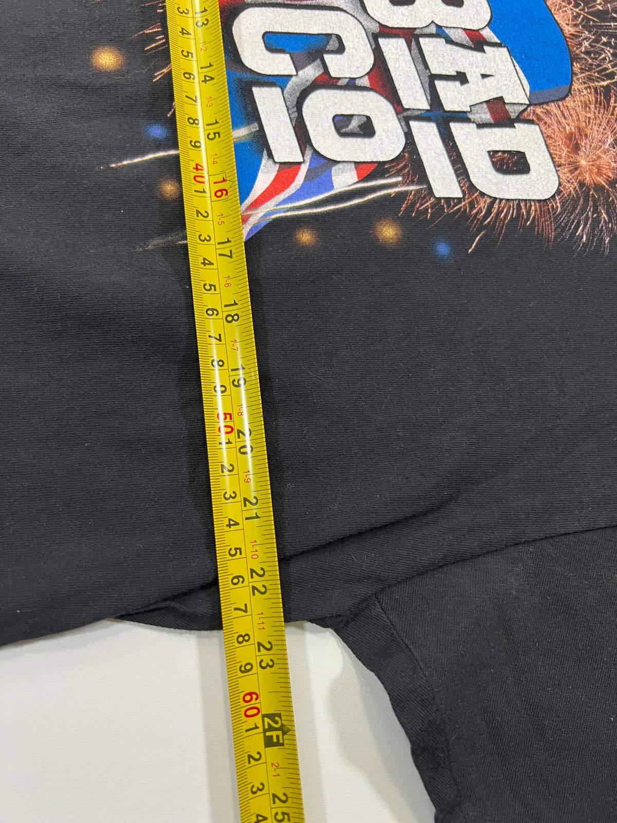 Black graphic T-shirt featuring a Styx Bad Co design with American and UK flags and fireworks.