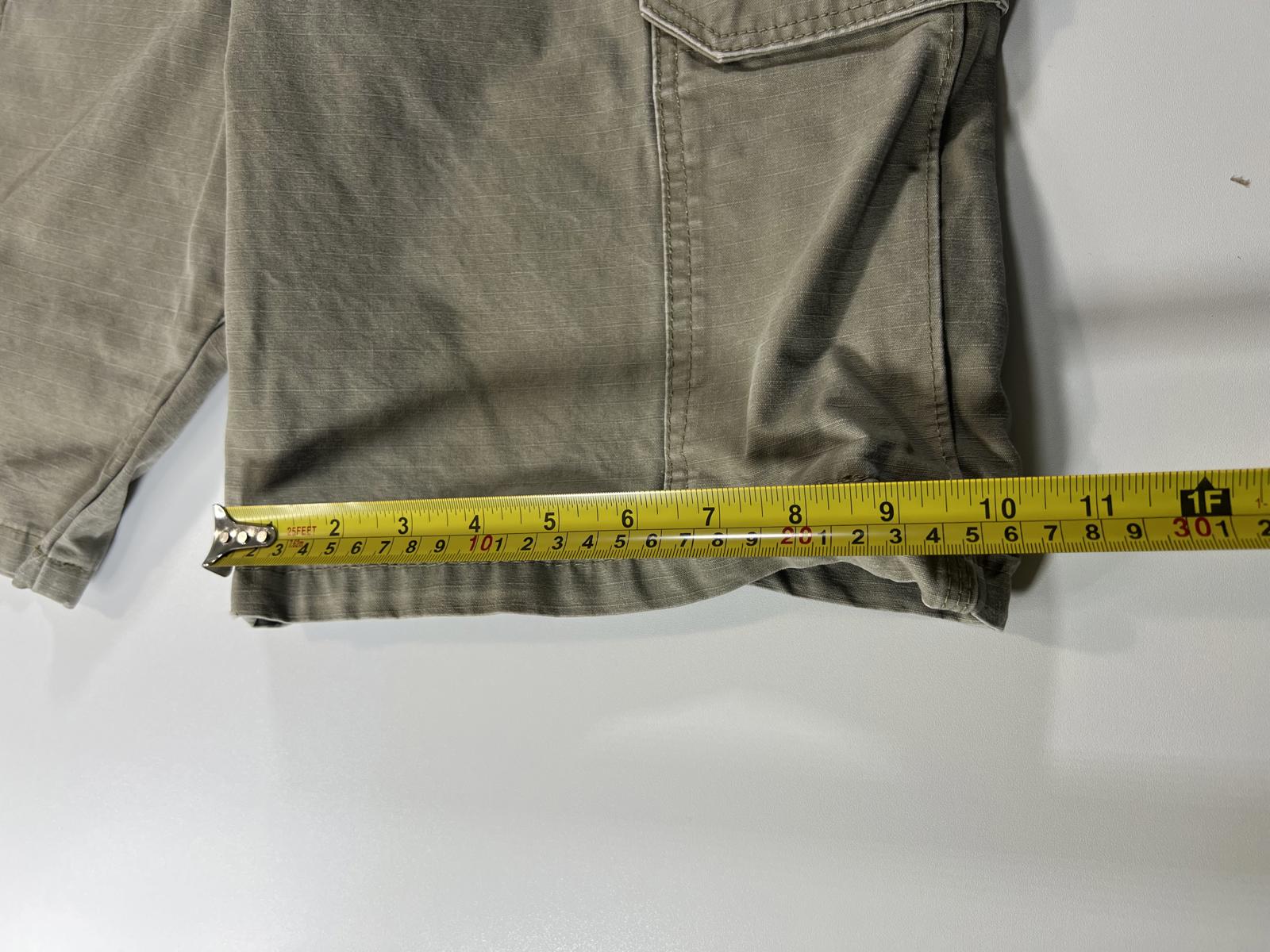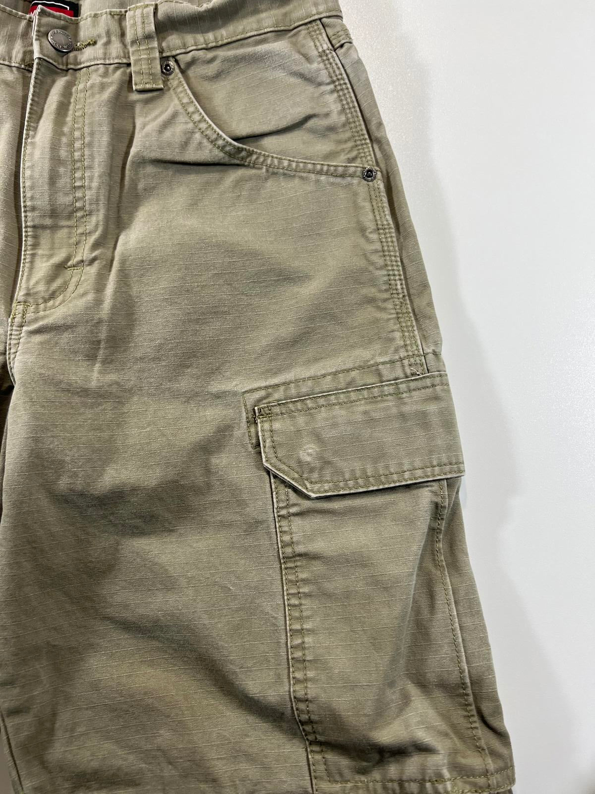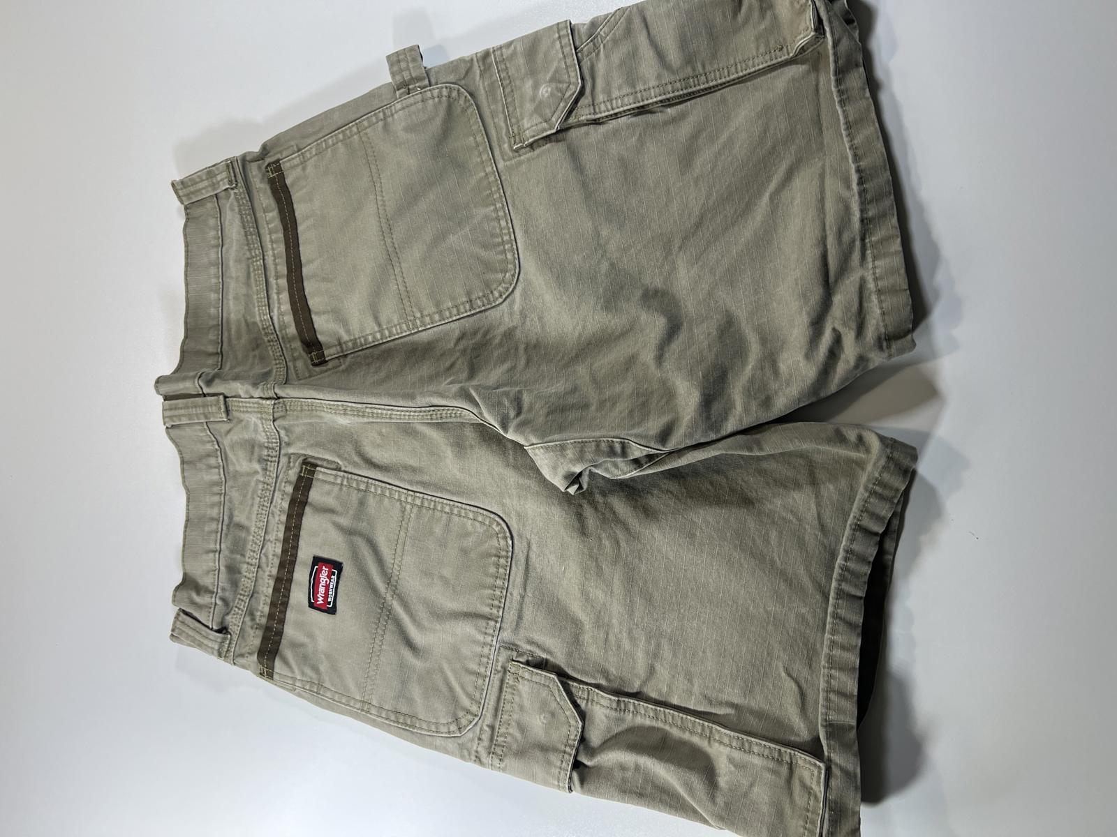 Wranglers Men's beige cargo shorts featuring multiple pockets for ample storage including side cargo pockets and front pockets with a brown accent detail. Durable fabric suitable for casual wear and outdoor activities. Comfortable fit with belt loops and a hammer loop on the side for added utility.