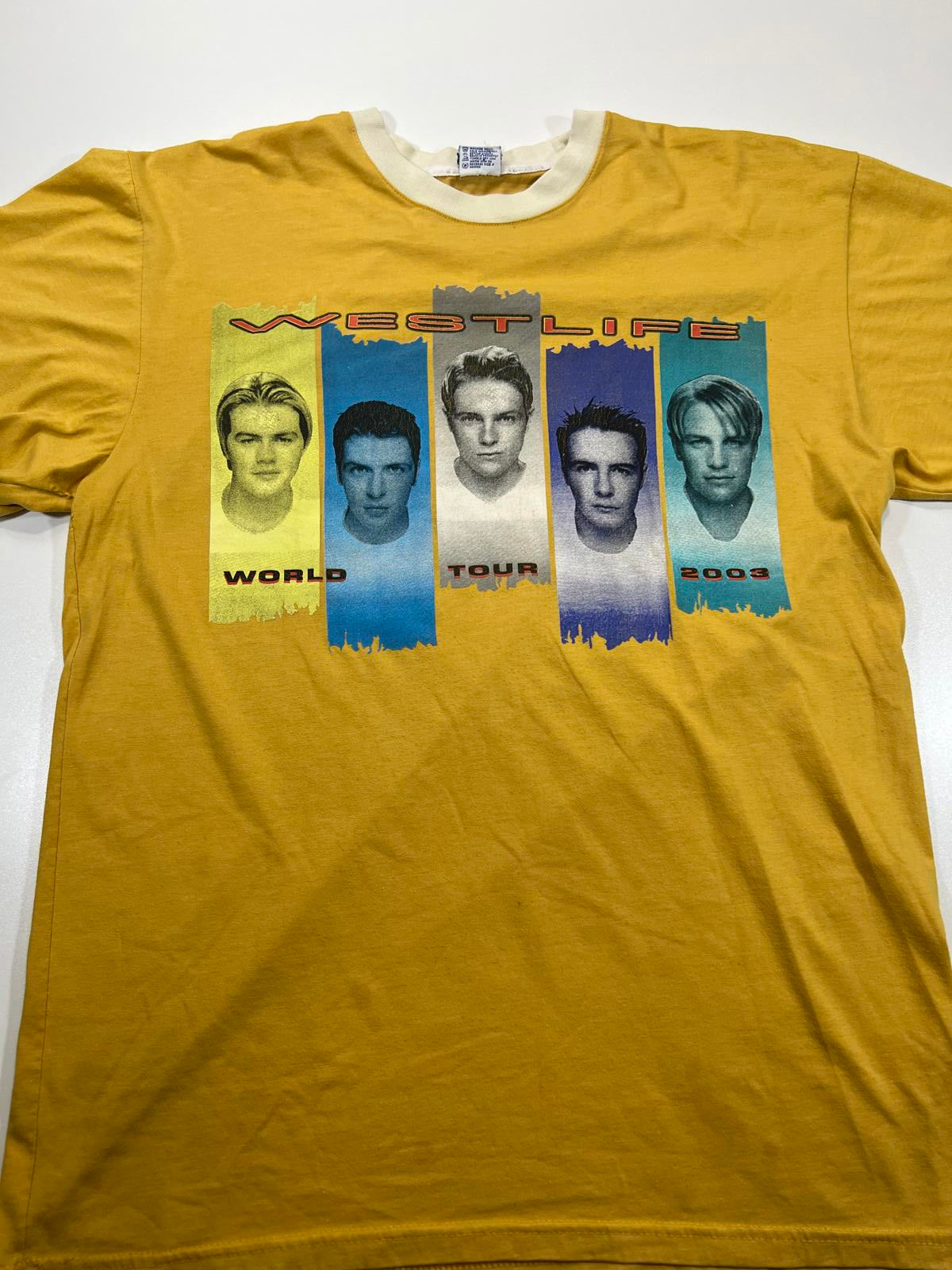 Vintage Westlife 2003 World Tour T-shirt featuring a yellow base with multicoloured graphic print of band members.