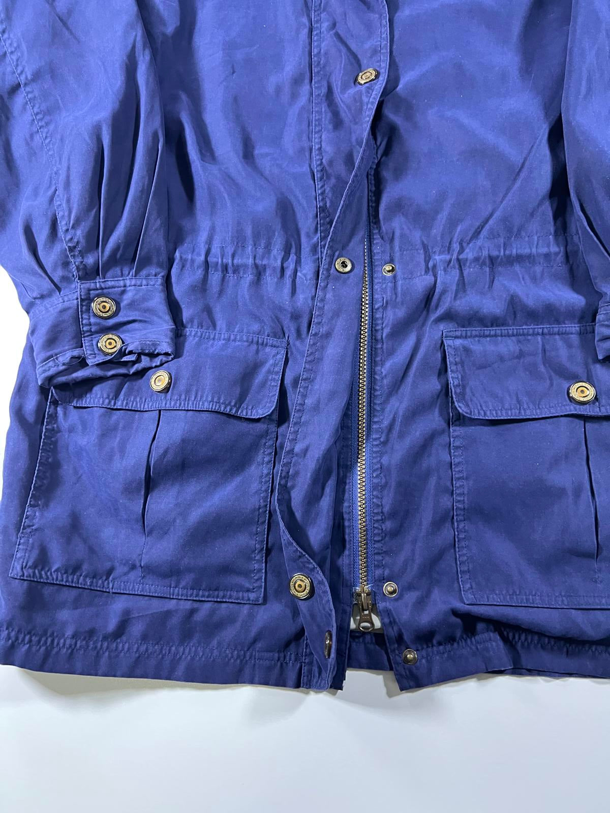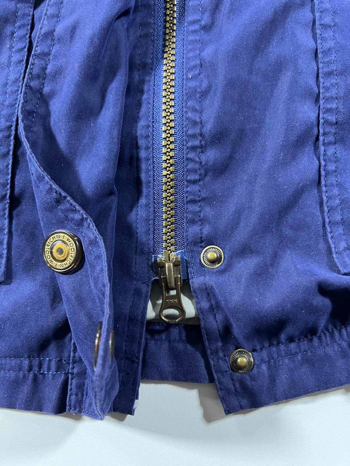 Woolrich women's outdoor jacket in medium size. Features a durable blue outer shell with a zip and snap button closure. Two front flap pockets with button details. Comfortable fit suitable for outdoor activities.