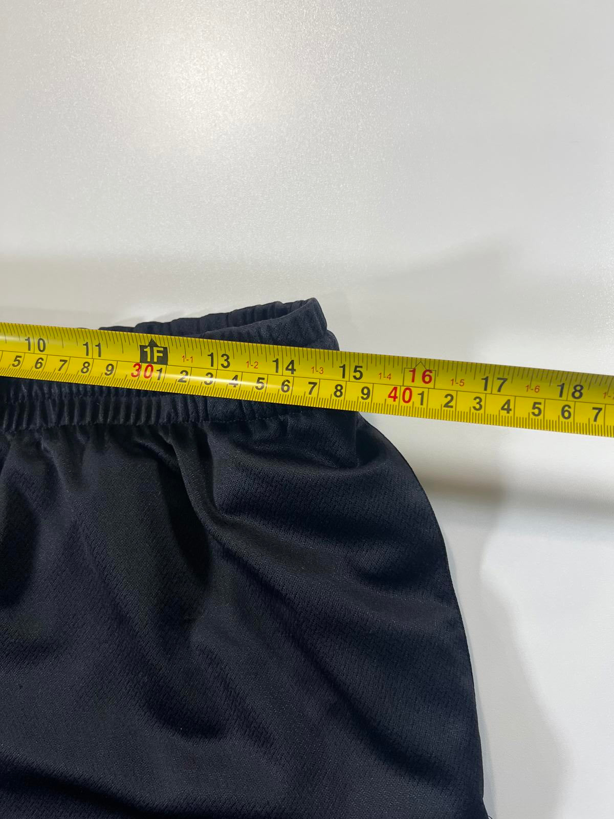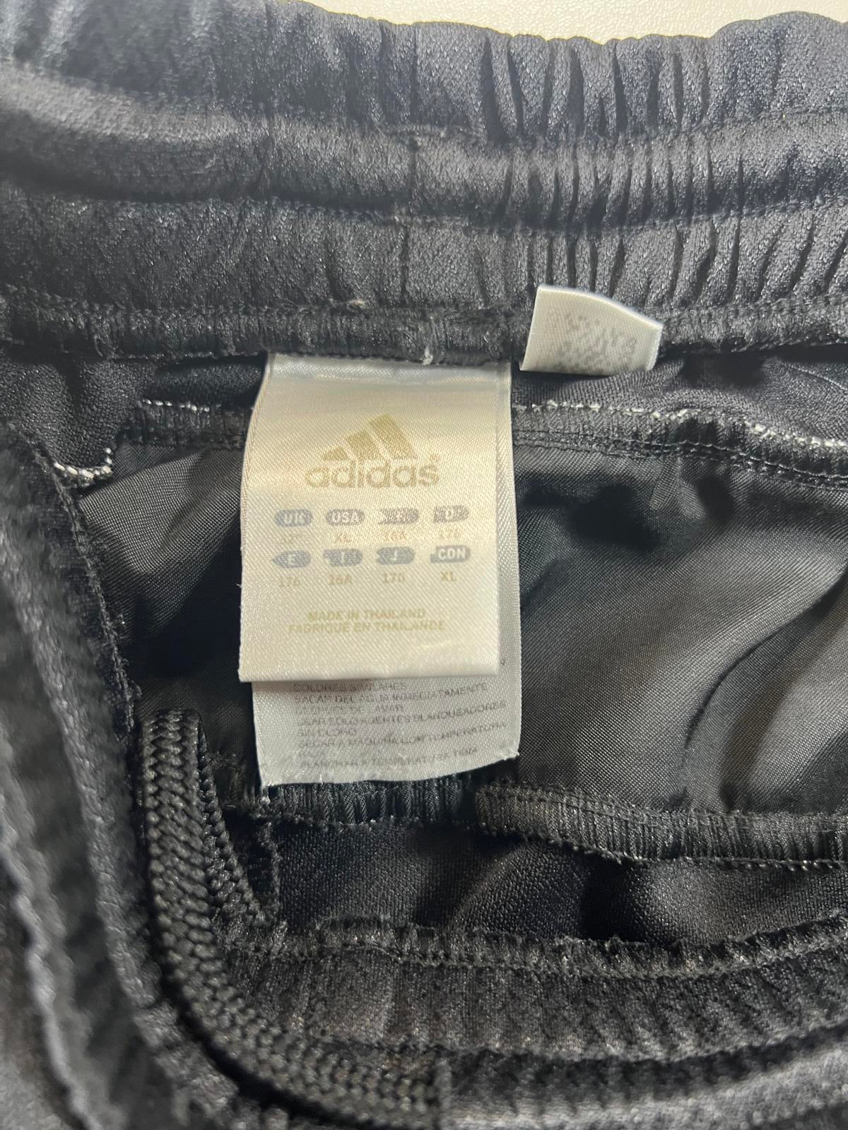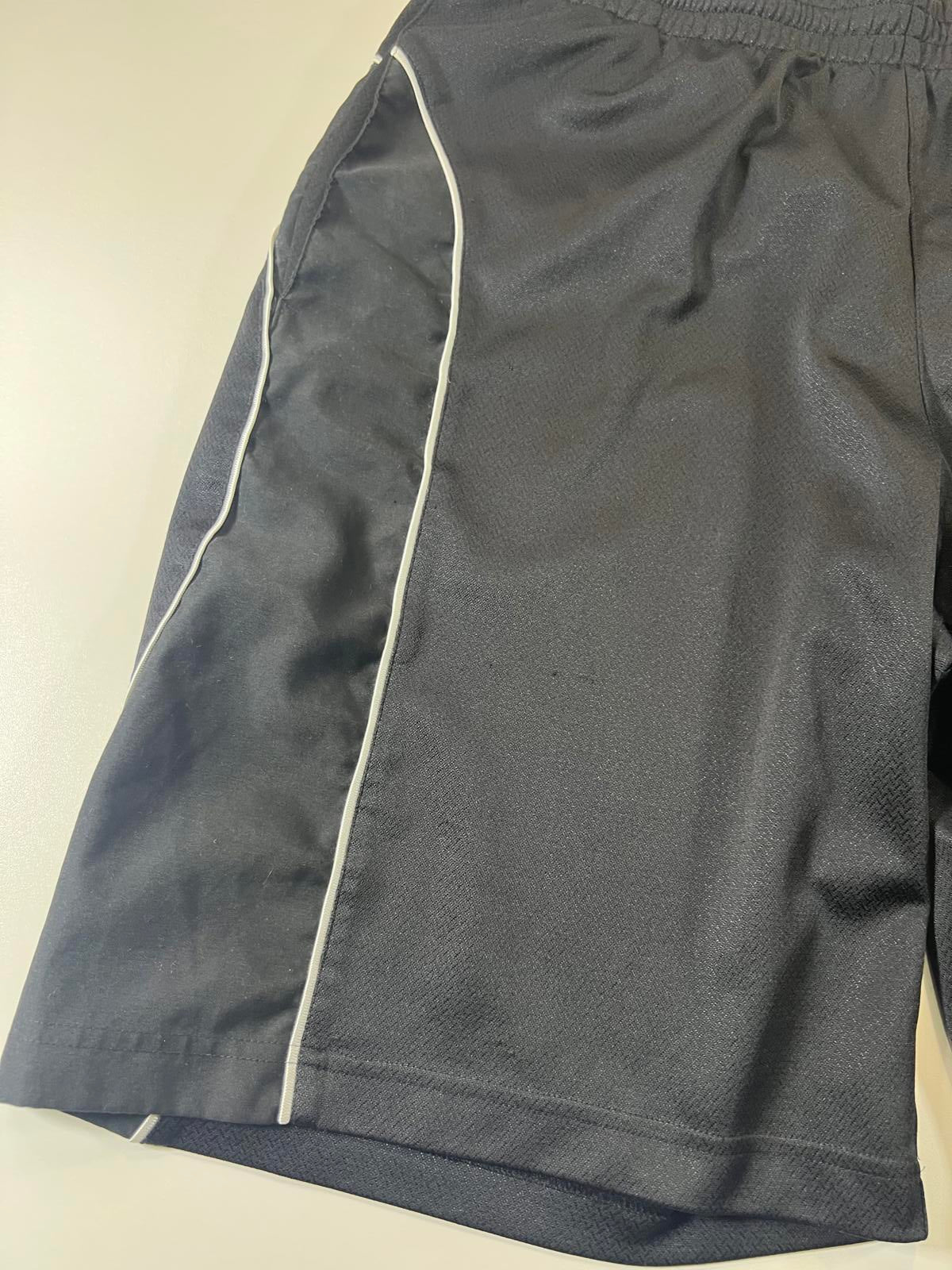 Men's athletic shorts by Adidas in black with white piping detail. Features an elastic waistband for a comfortable fit and a large Adidas logo on the left leg. Made from lightweight, breathable fabric suitable for sports and casual wear. In very good condition with minimal signs of wear.