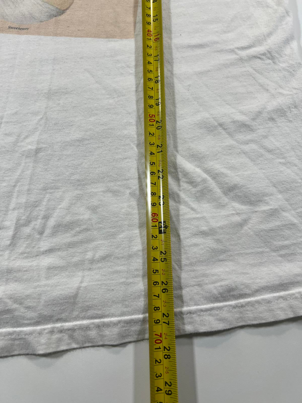 White short-sleeve graphic t-shirt featuring the Ariana Grande Sweetener album cover print on the front.