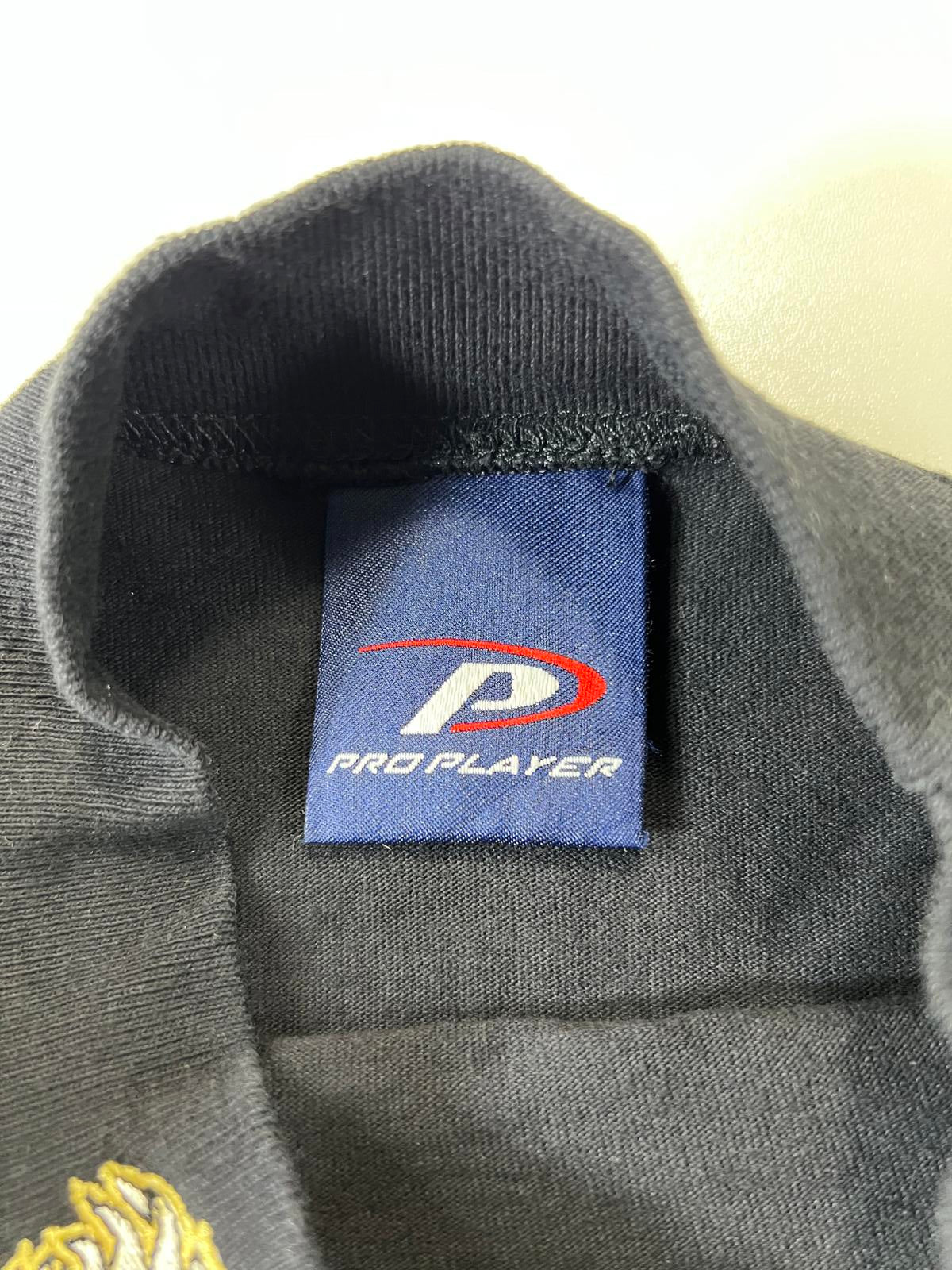 Black long sleeve shirt featuring the Calgary Flames logo embroidered near the collar and a small Pro Player logo on the sleeve cuff. Comfortable ribbed cuffs and collar. Suitable for casual wear or supporting your team.
