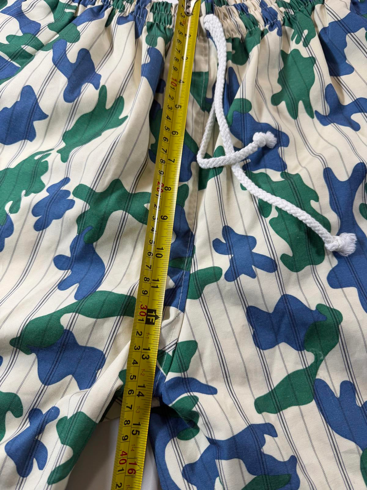 Comfortable CHICHA Sport shorts featuring a unique camouflage print in green and blue on a cream background with thin vertical stripes. Elastic waistband with a white drawstring for adjustable fit. Lightweight and breathable fabric ideal for casual wear or sports activities. Includes side pockets for convenience.