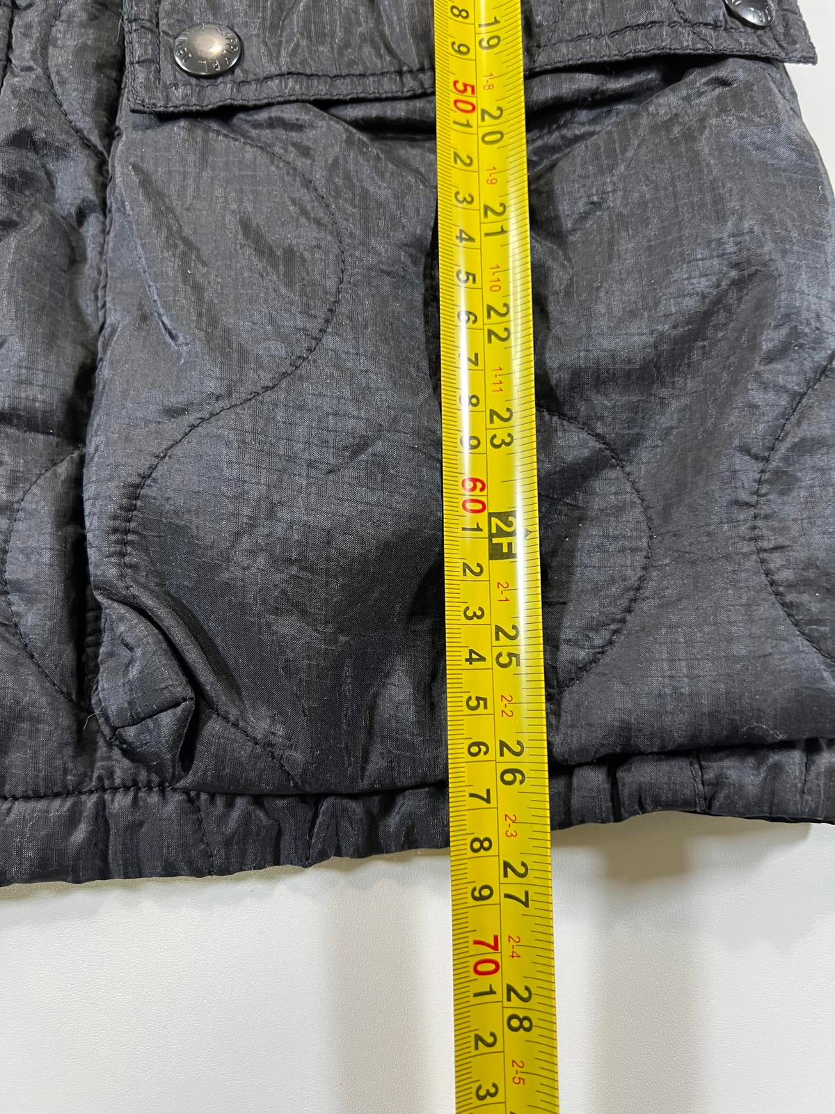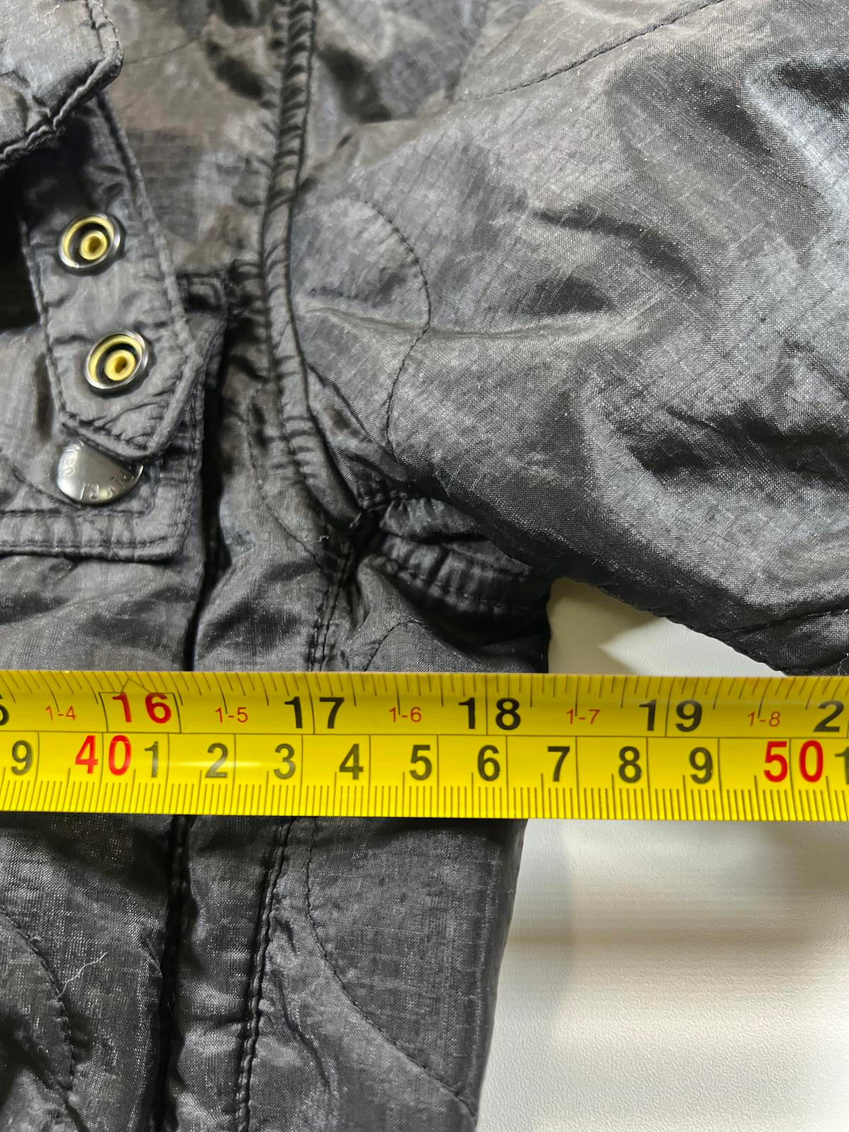 Black nylon jacket featuring multiple front pockets and snap button closures. Includes a distinctive USA flag patch on the sleeve. Lightweight and suitable for casual wear.