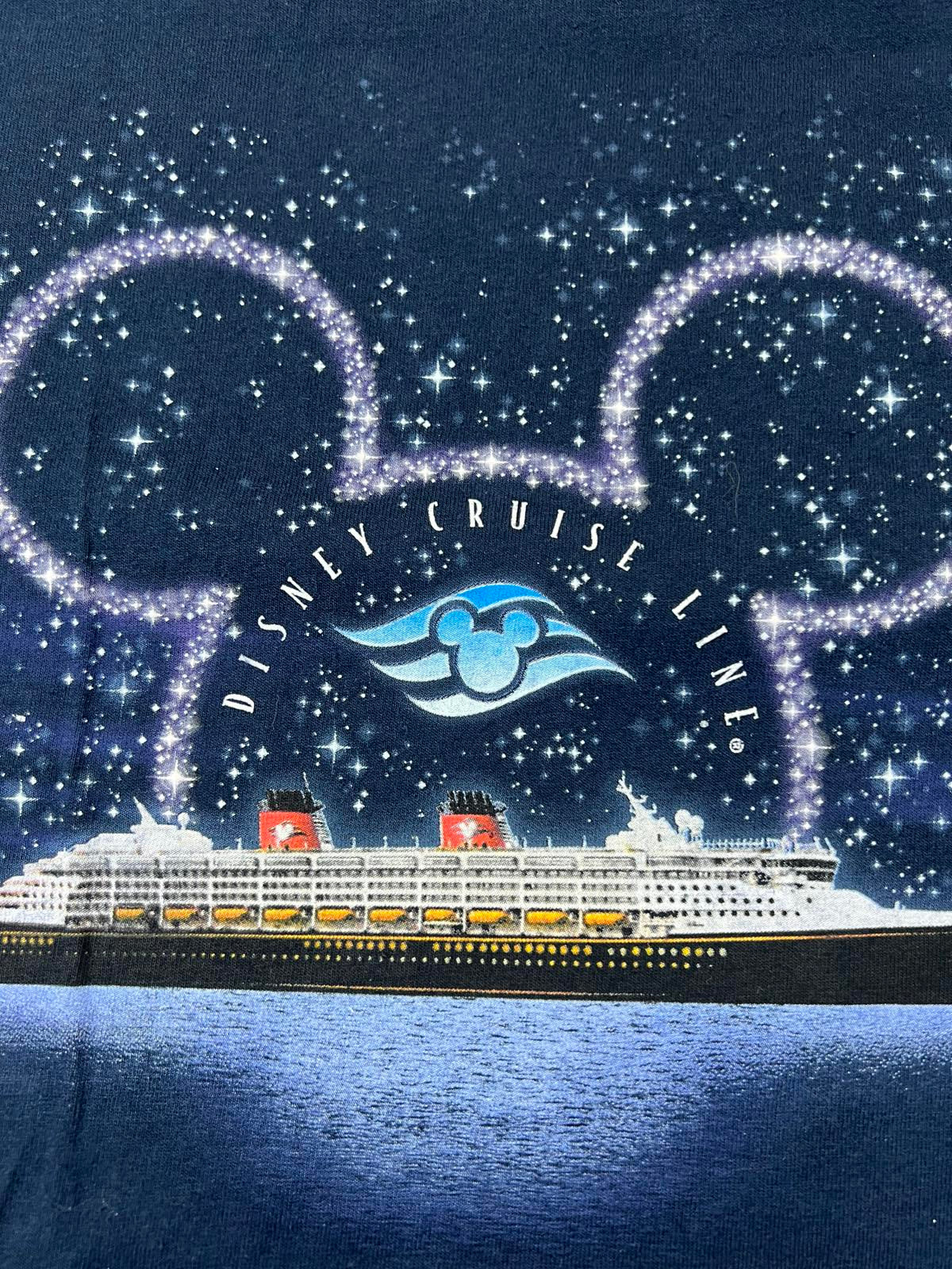 Navy blue Disney Cruise Line T-shirt featuring a sparkling Mickey Mouse silhouette and cruise ship graphic. Made of 100% cotton for comfortable wear. Size Large. Perfect for Disney fans and cruise enthusiasts.