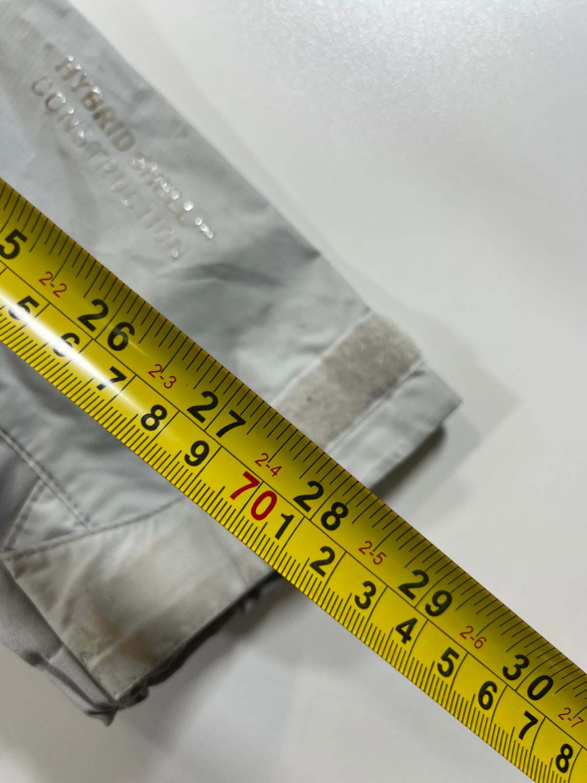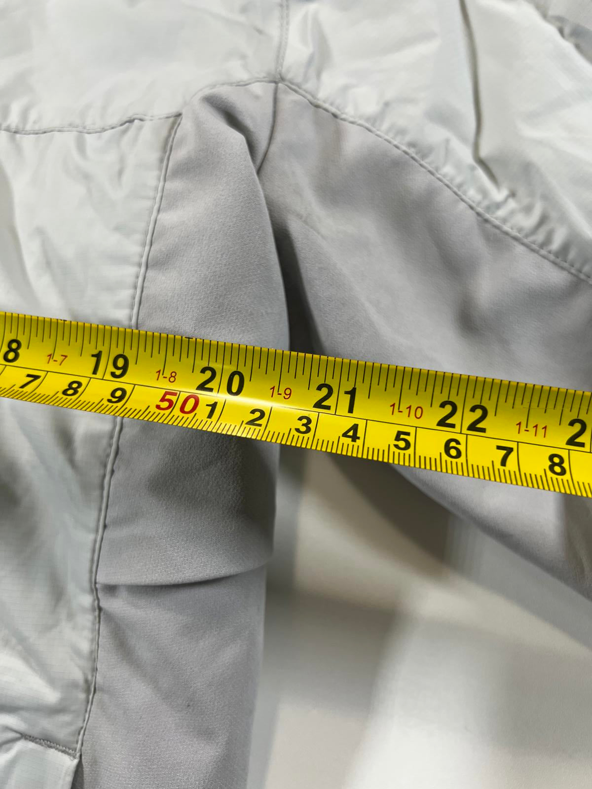 Lightweight men's hooded windbreaker jacket by Helly Hansen in size Medium. Features a full front zipper with orange accents, adjustable hood, and elastic cuffs with velcro closures. Made for casual wear and outdoor activities, providing protection against wind and light rain. The jacket is primarily light grey with a bright orange interior lining and zipper details.