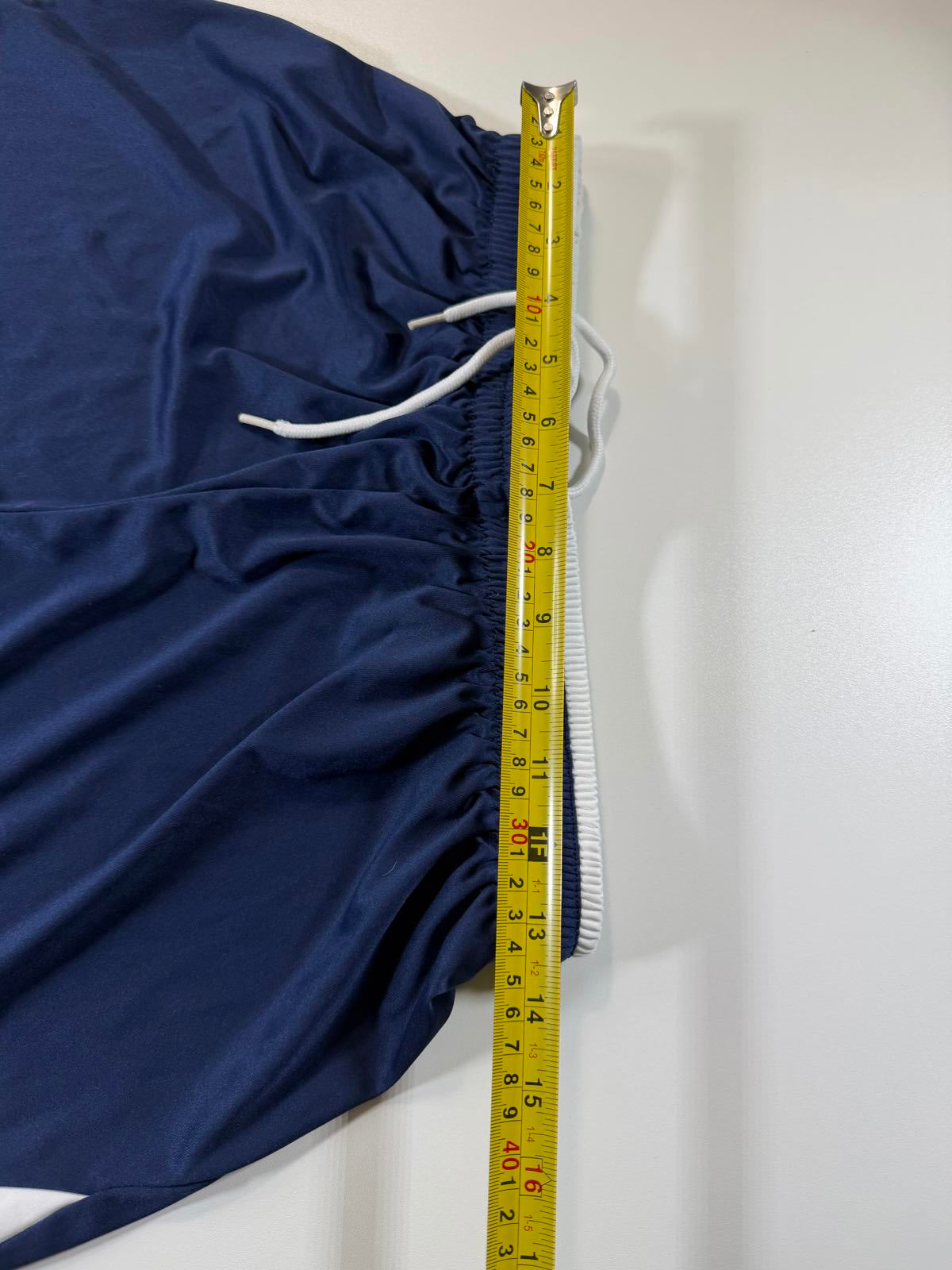 Men's athletic shorts in navy blue featuring white diagonal stripe accents on the sides. Elastic waistband with white drawstring for adjustable fit. Lightweight and breathable fabric ideal for sports and casual wear.