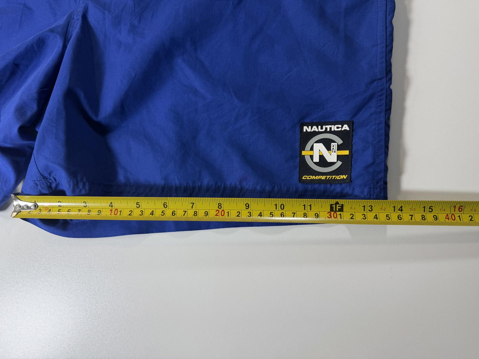 Men's swim shorts by Nautica, featuring a vibrant blue body with a black waistband. Designed with an elastic waistband for a comfortable fit. Decorated with yellow zigzag stitching detail and the Nautica Competition logo patch on the leg. Ideal for swimming or casual beachwear.