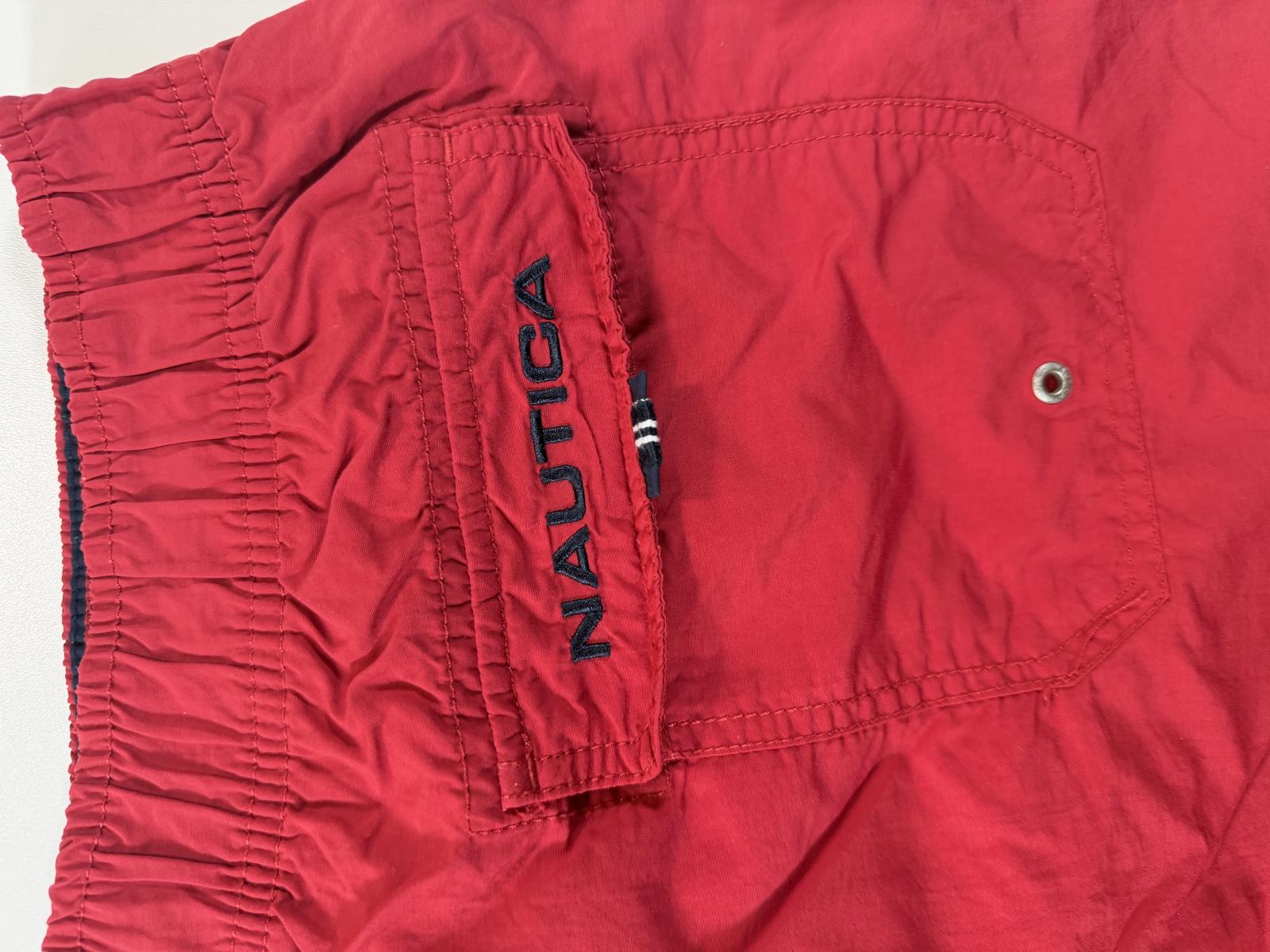 Red Nautica swim shorts featuring an elastic waistband for a comfortable fit. Designed with a navy and white striped side panel and embroidered Nautica logo near the hem. Lightweight and quick-drying fabric ideal for swimming and beach activities.