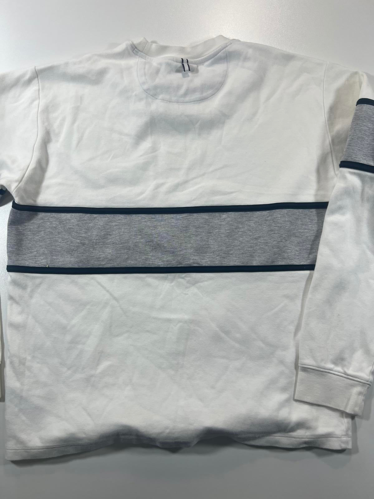 White with grey and black horizontal stripes featuring the 'new balance' logo on the chest.