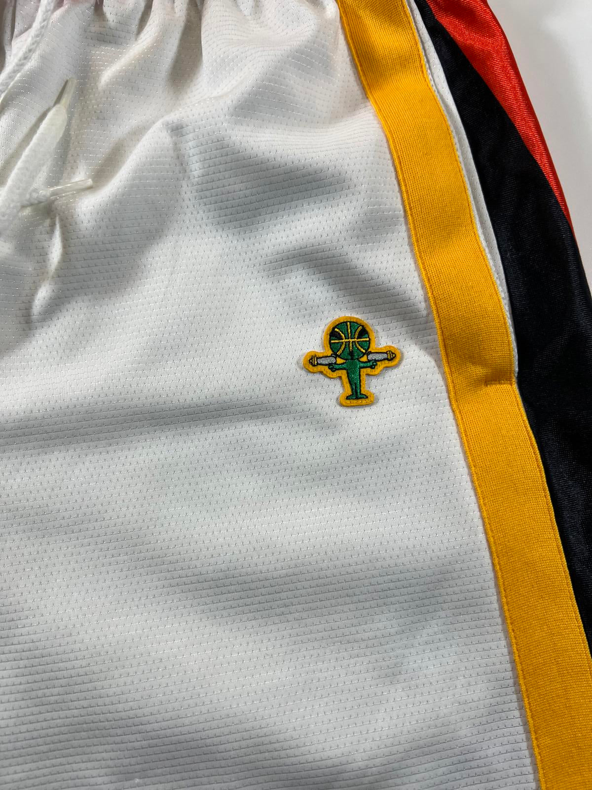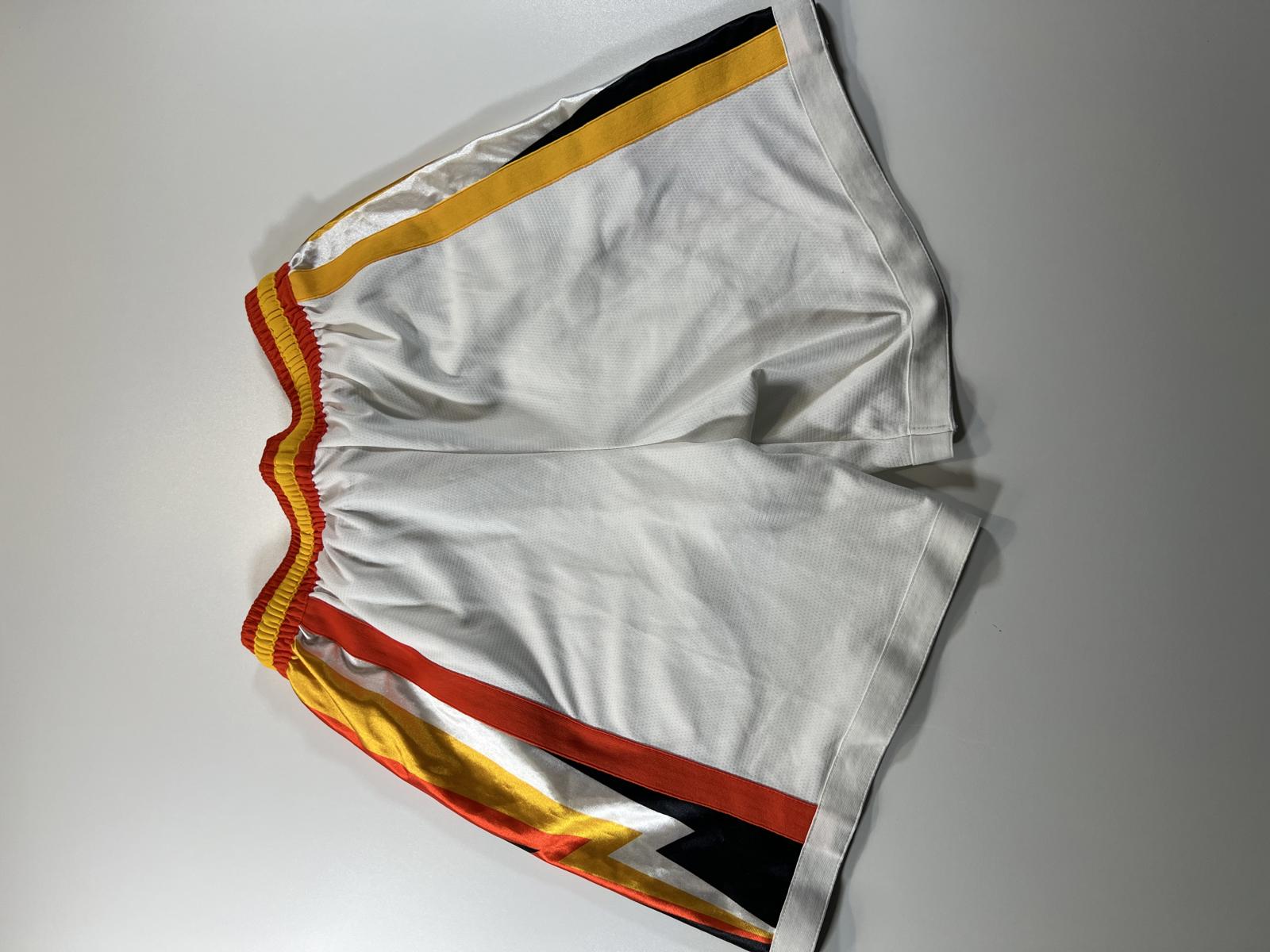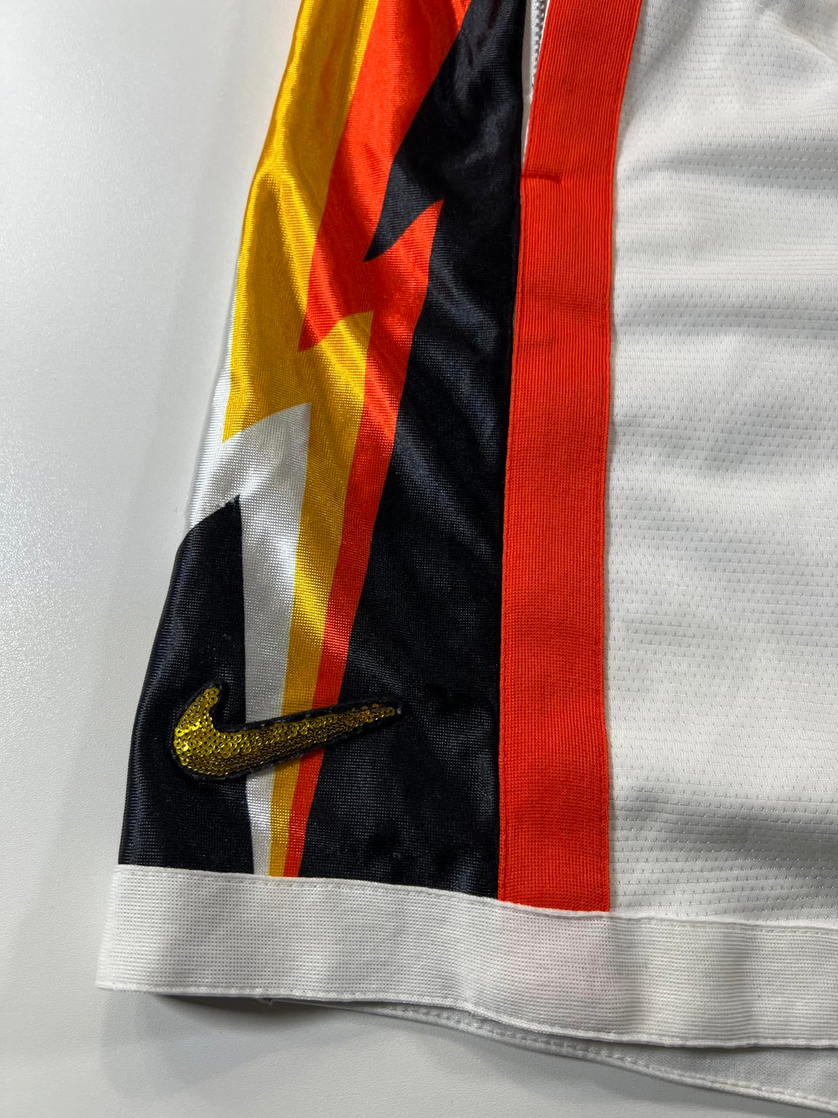 White basketball shorts featuring vibrant yellow, red, and black lightning bolt stripes on the sides. Includes an embroidered green and yellow logo on the front and a gold Nike swoosh on the lower side. Elastic waistband with adjustable drawstring for a secure fit. Made from breathable mesh fabric, ideal for sports and casual wear.