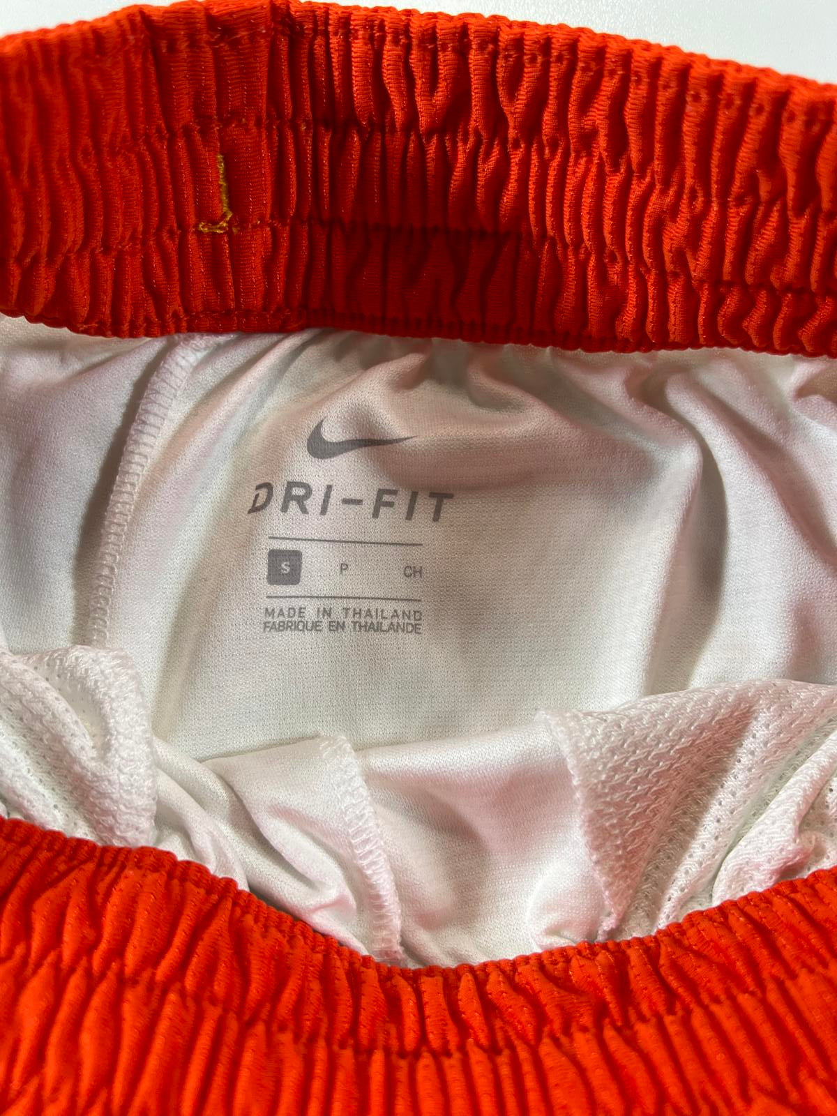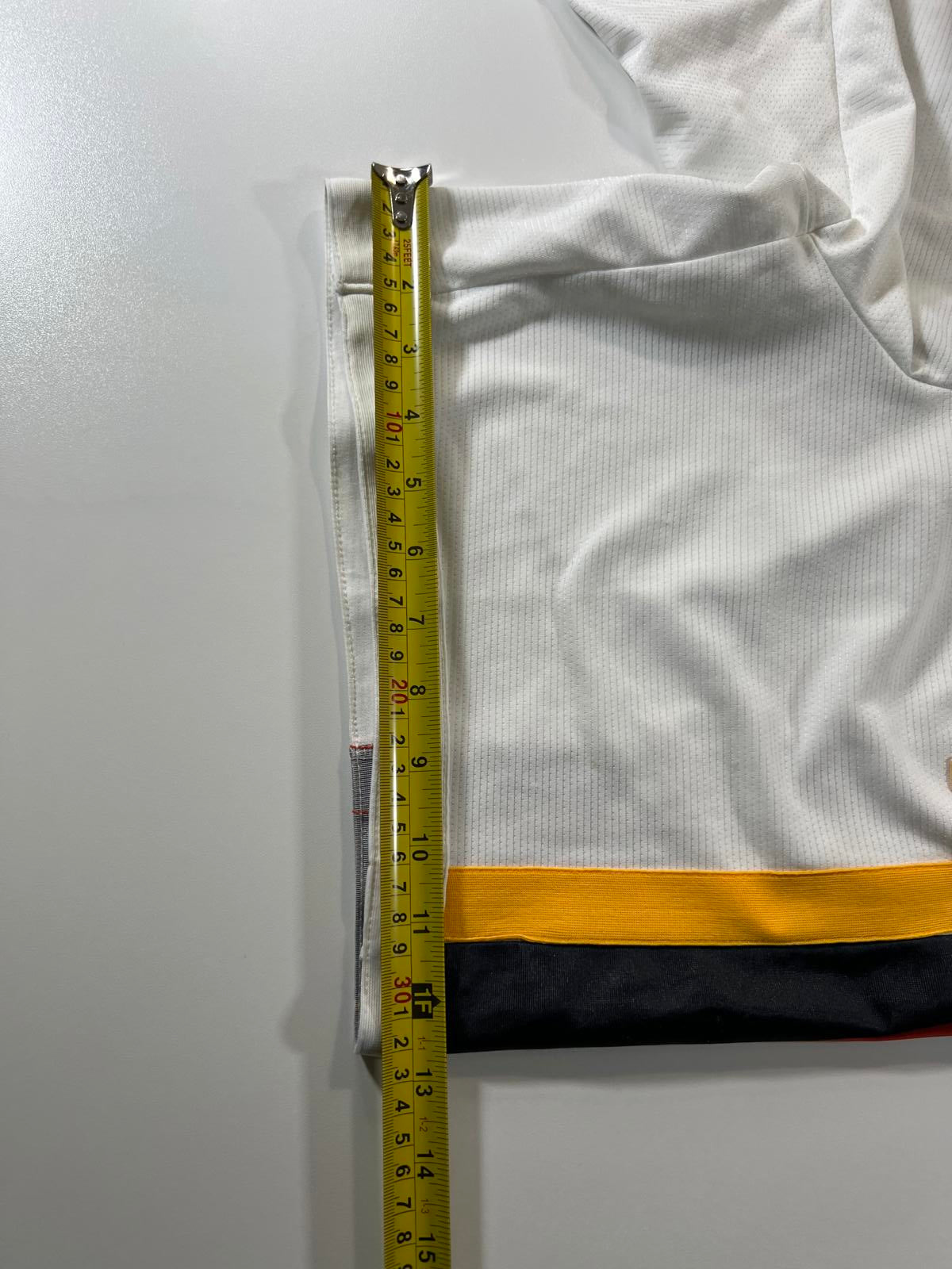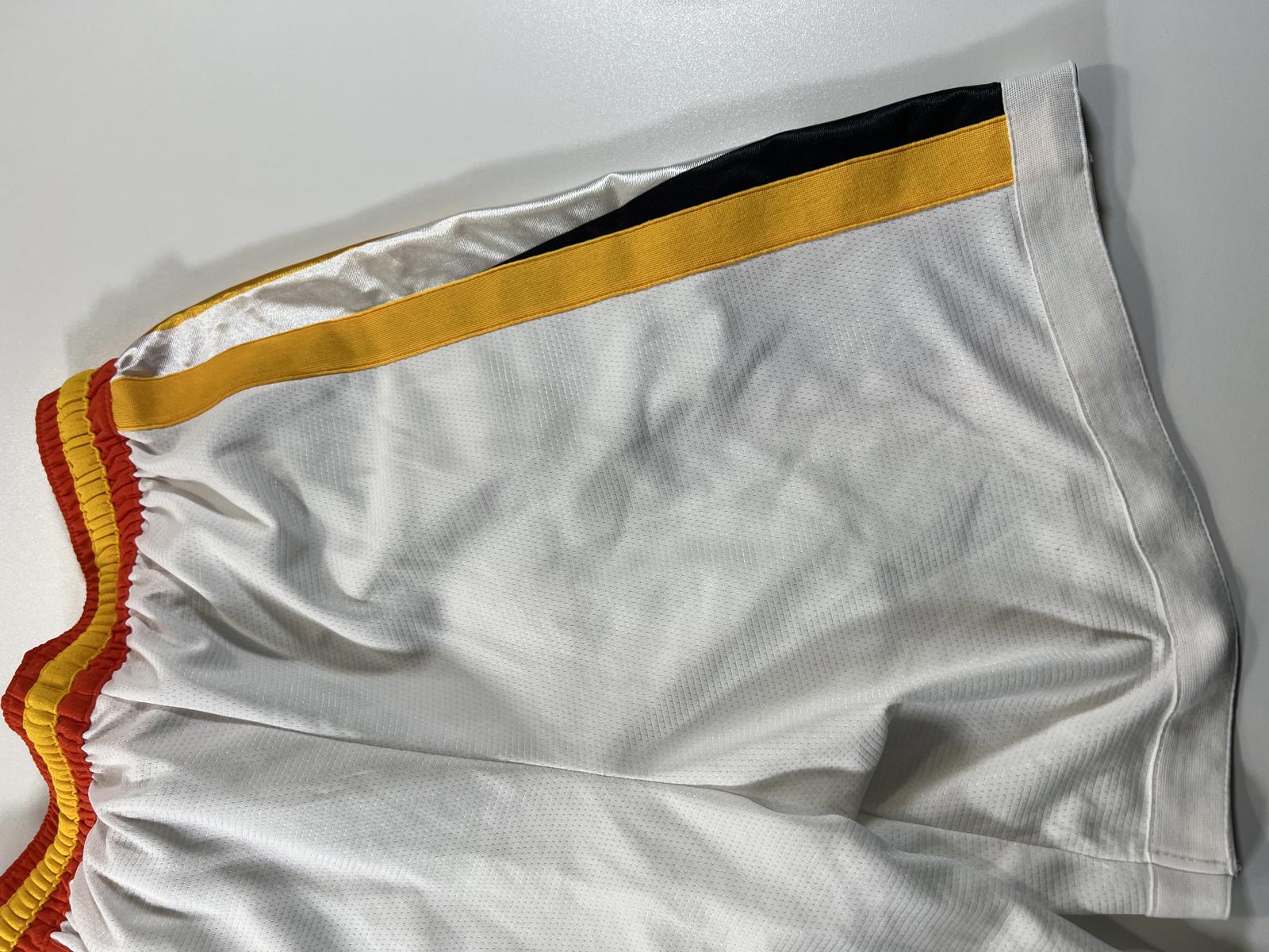 White basketball shorts featuring vibrant yellow, red, and black lightning bolt stripes on the sides. Includes an embroidered green and yellow logo on the front and a gold Nike swoosh on the lower side. Elastic waistband with adjustable drawstring for a secure fit. Made from breathable mesh fabric, ideal for sports and casual wear.