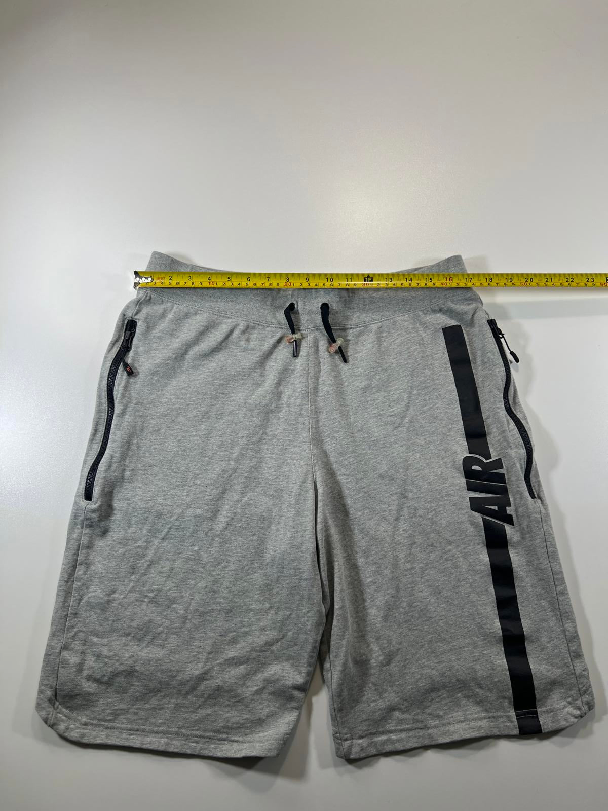 Nike Comfortable grey athletic shorts featuring an elastic waistband with adjustable drawstring for a secure fit. Two side zipper pockets provide secure storage. The right leg is adorned with a black vertical stripe and 'AIR' print for a sporty look. Ideal for casual wear or workouts.