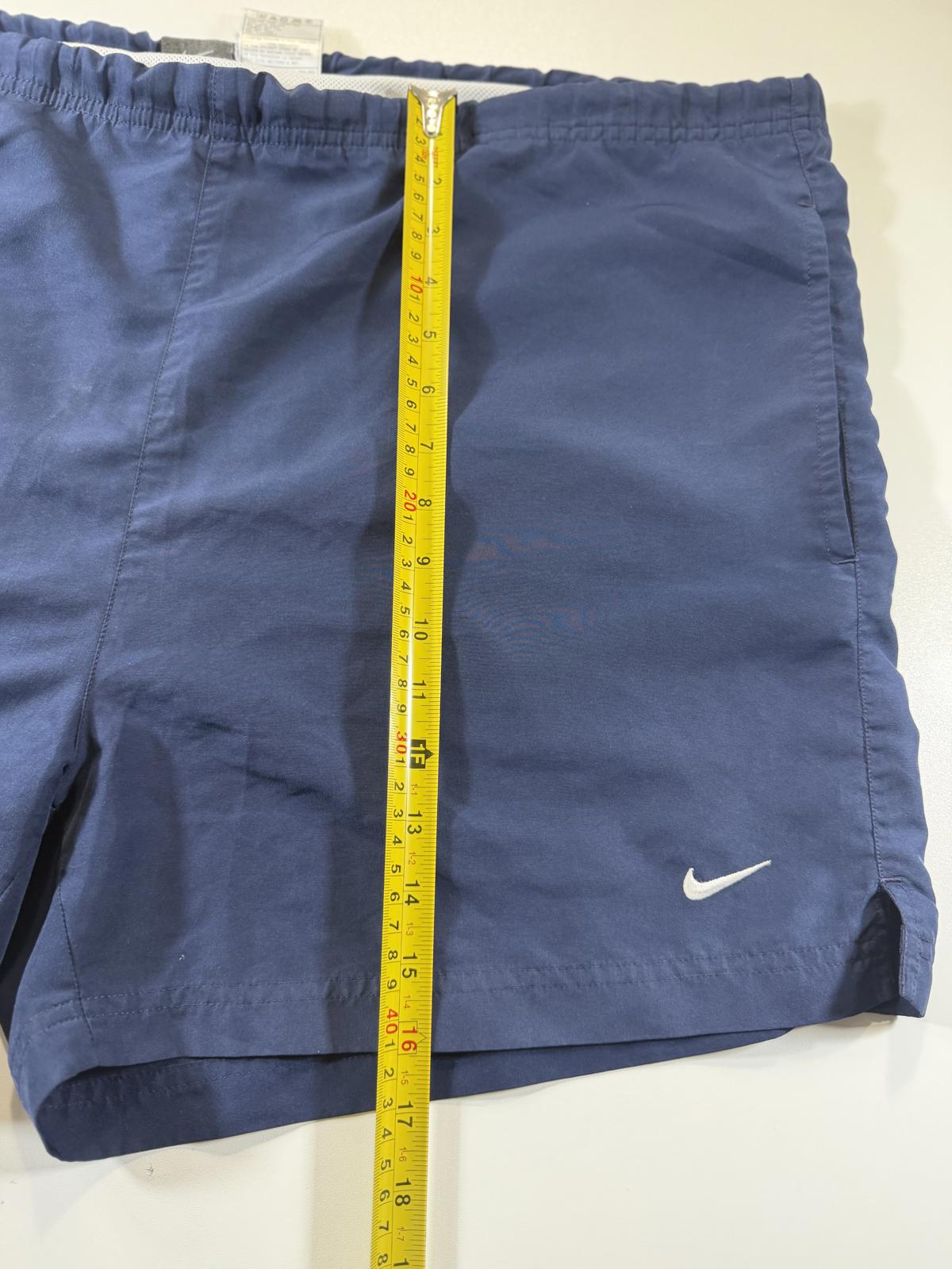 Navy blue athletic shorts featuring an elastic waistband for a comfortable fit. Lightweight and breathable fabric ideal for sports or casual wear. Includes side pockets and a small white Nike logo on the front left leg. Suitable for everyday active use.
