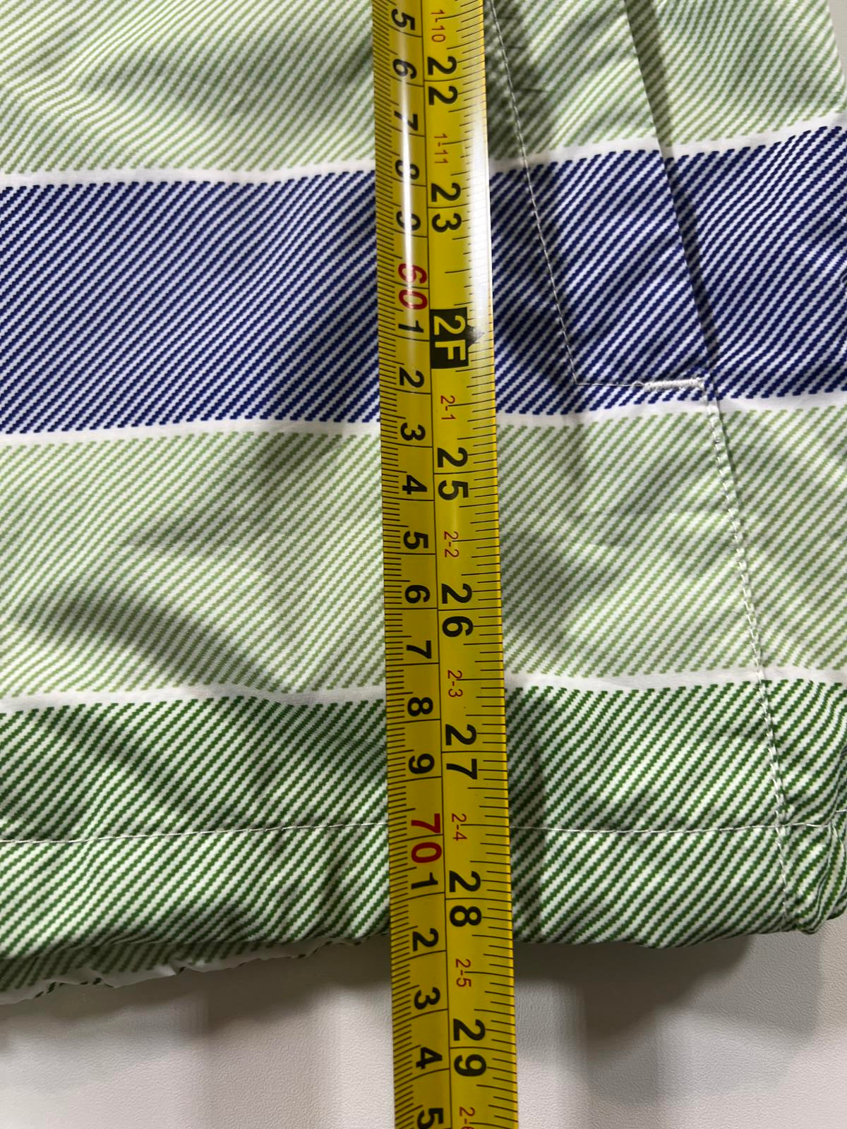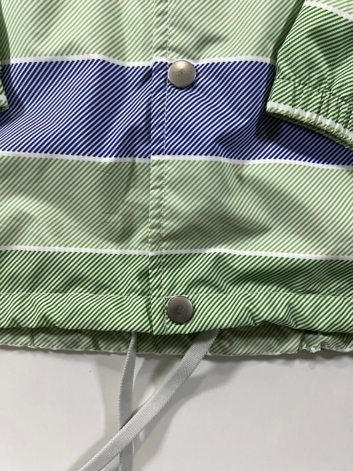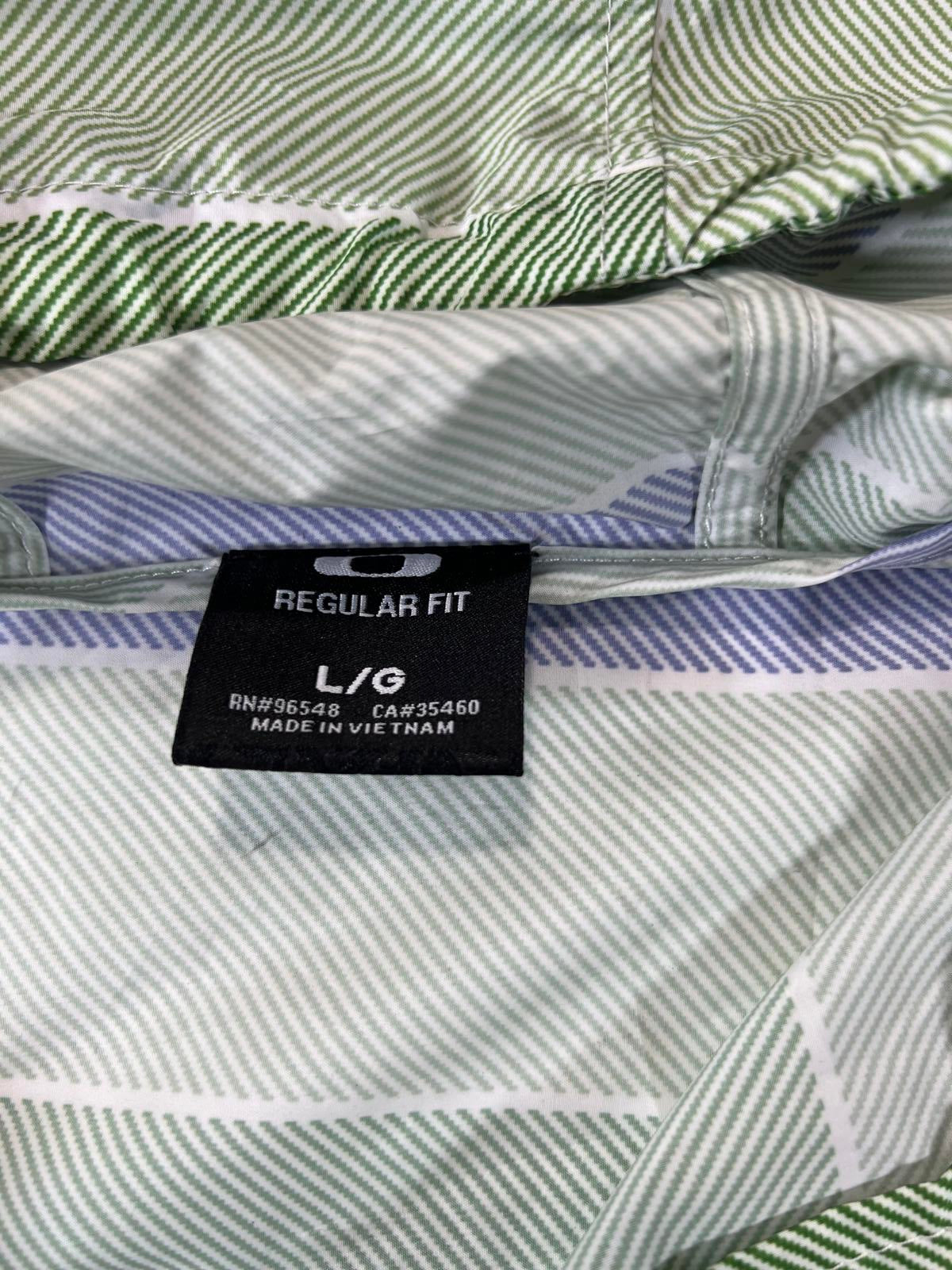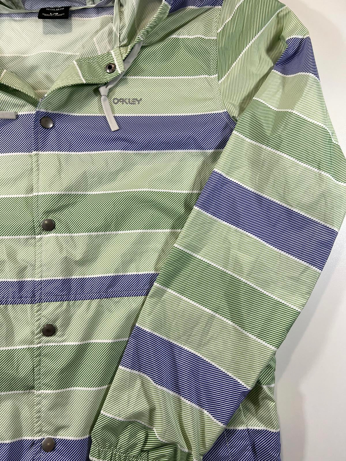 Oakley men's windbreaker jacket in a regular fit, size large. Features a hood with adjustable drawstrings and snap button front closure. The jacket has a striped pattern in green and blue tones with subtle Oakley branding on the chest. Lightweight and suitable for casual wear or light outdoor activities.
