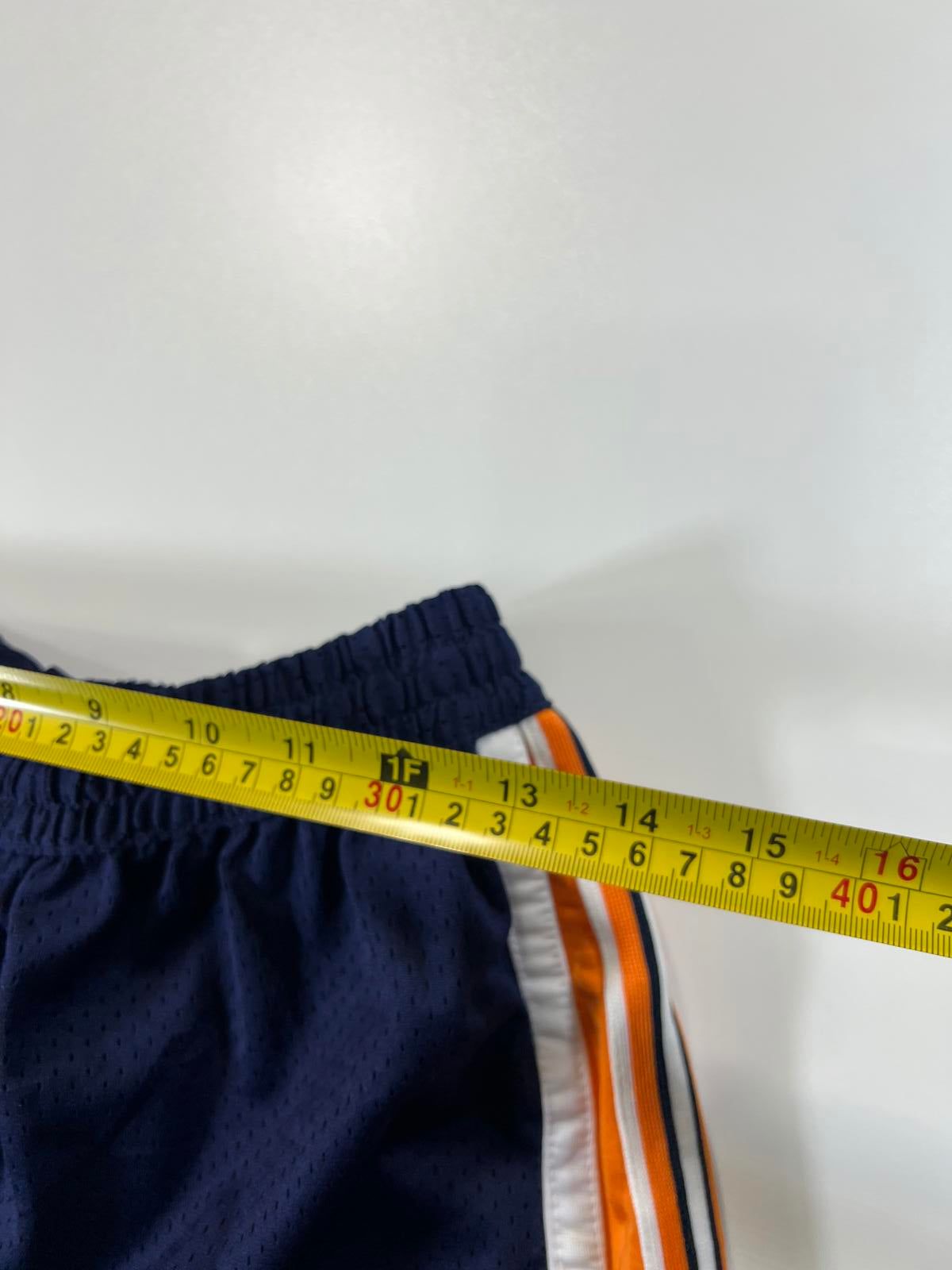 Men's athletic shorts featuring breathable mesh fabric for comfort and ventilation. Navy blue base with vibrant orange and white side stripes for a sporty look. Elastic waistband ensures a secure and adjustable fit. Ideal for workouts, sports, or casual wear.