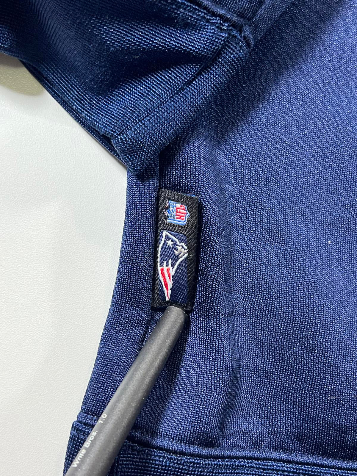 This New England Patriots crewneck sweatshirt features the team logo and 'Patriots Football' text on the front. It is a comfortable and stylish piece for fans, made with quality materials suitable for casual wear or game days. The sweatshirt includes NFL patches on the sleeves and white piping details for added style.