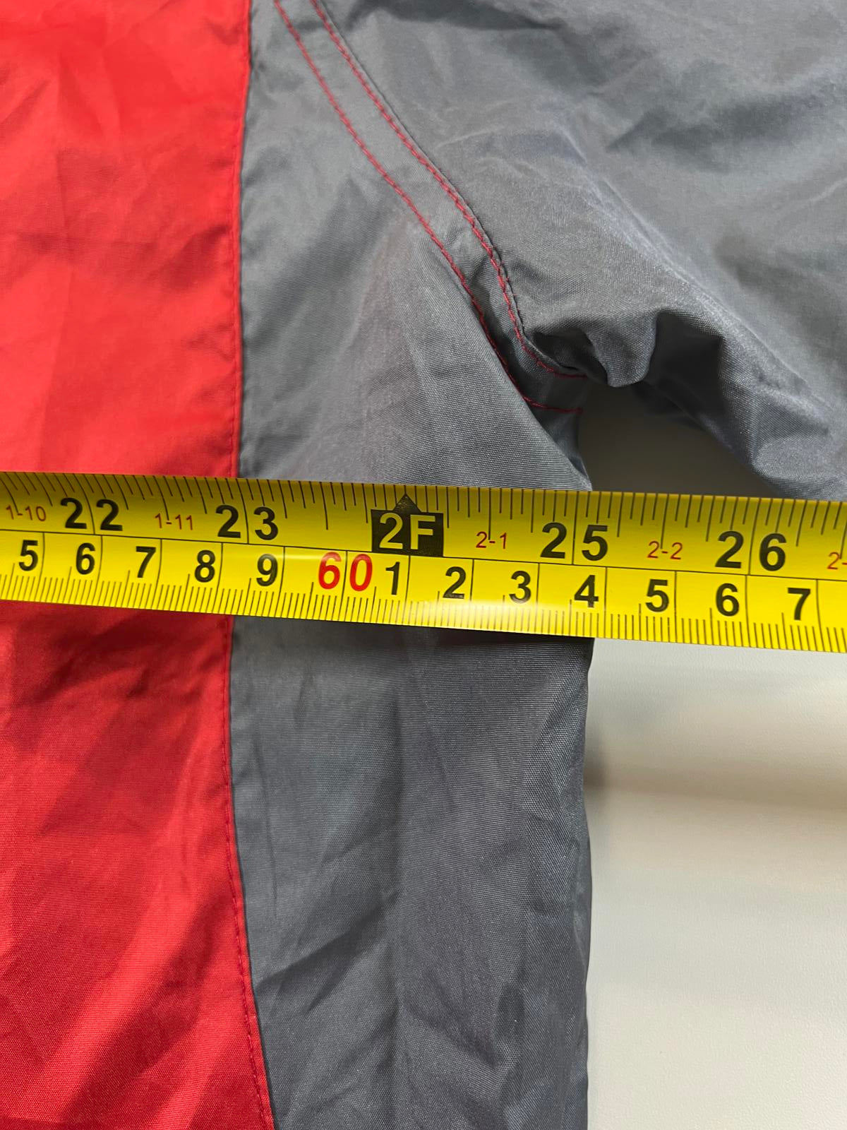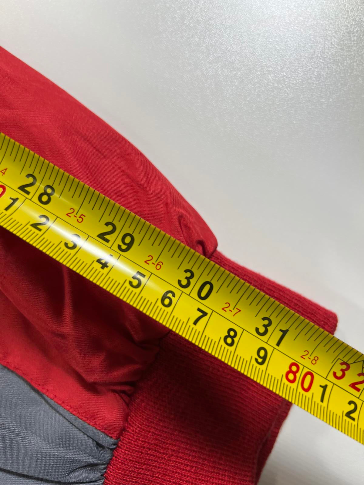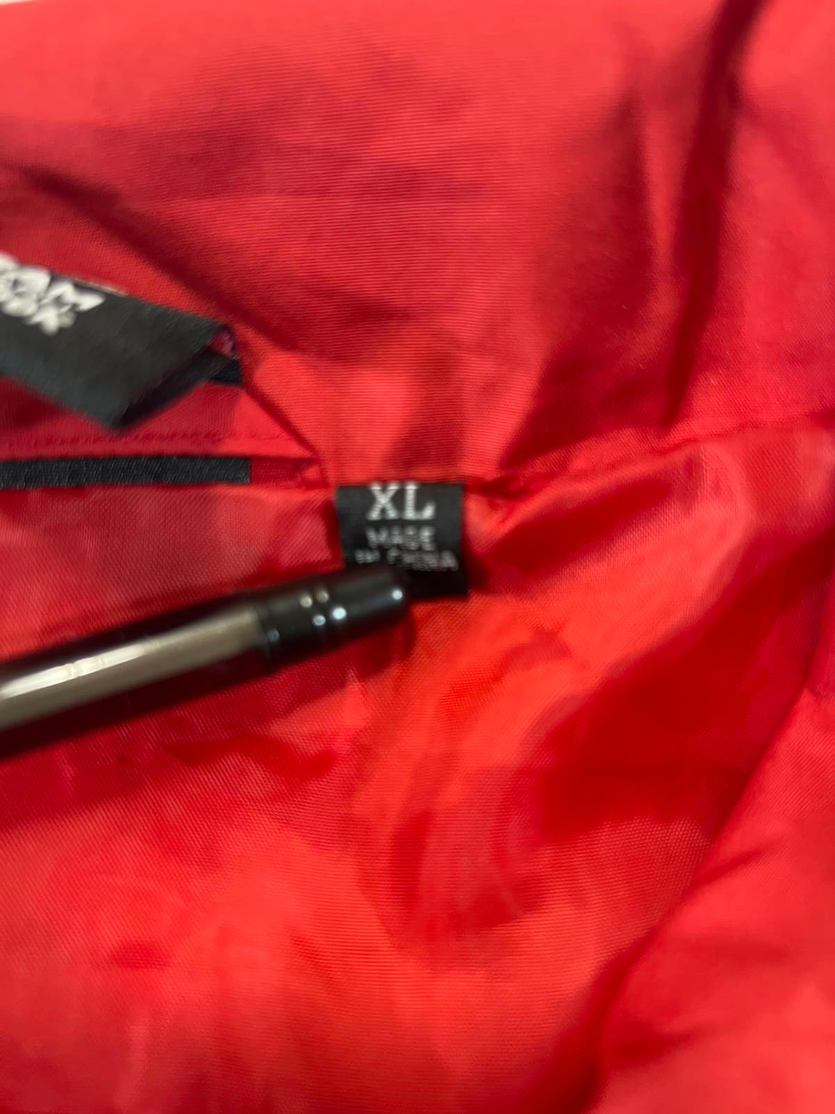 See photos for measurements and flawsFull front zipper with elastic cuffs and hem for a secure fit. Color-block design in red, white, and grey with embroidered team and brand logos. Perfect for casual wear or showing team spirit during cooler weather.