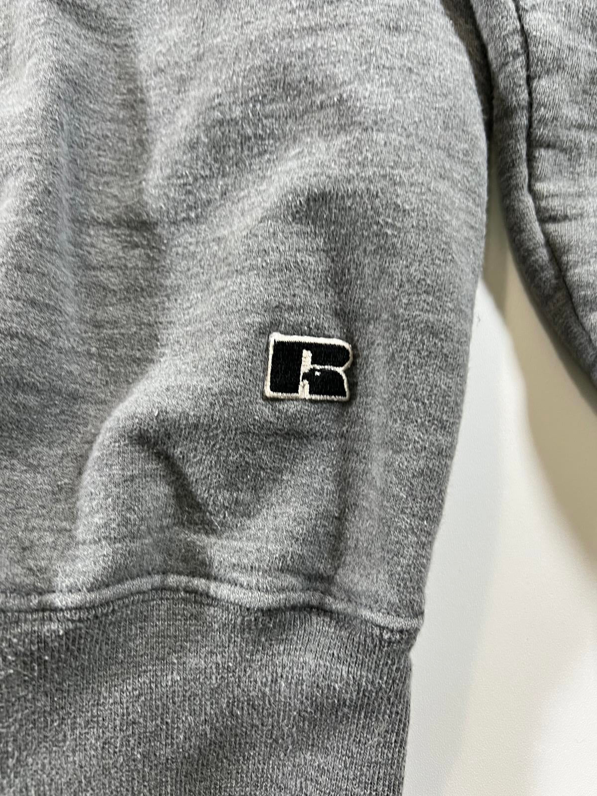 Comfortable grey sweatshirt featuring embroidered Washington State Golf logo on the chest. Made by Russell Athletic, known for quality sportswear. Ribbed cuffs and hem for a secure fit. Perfect for casual wear or light outdoor activities.