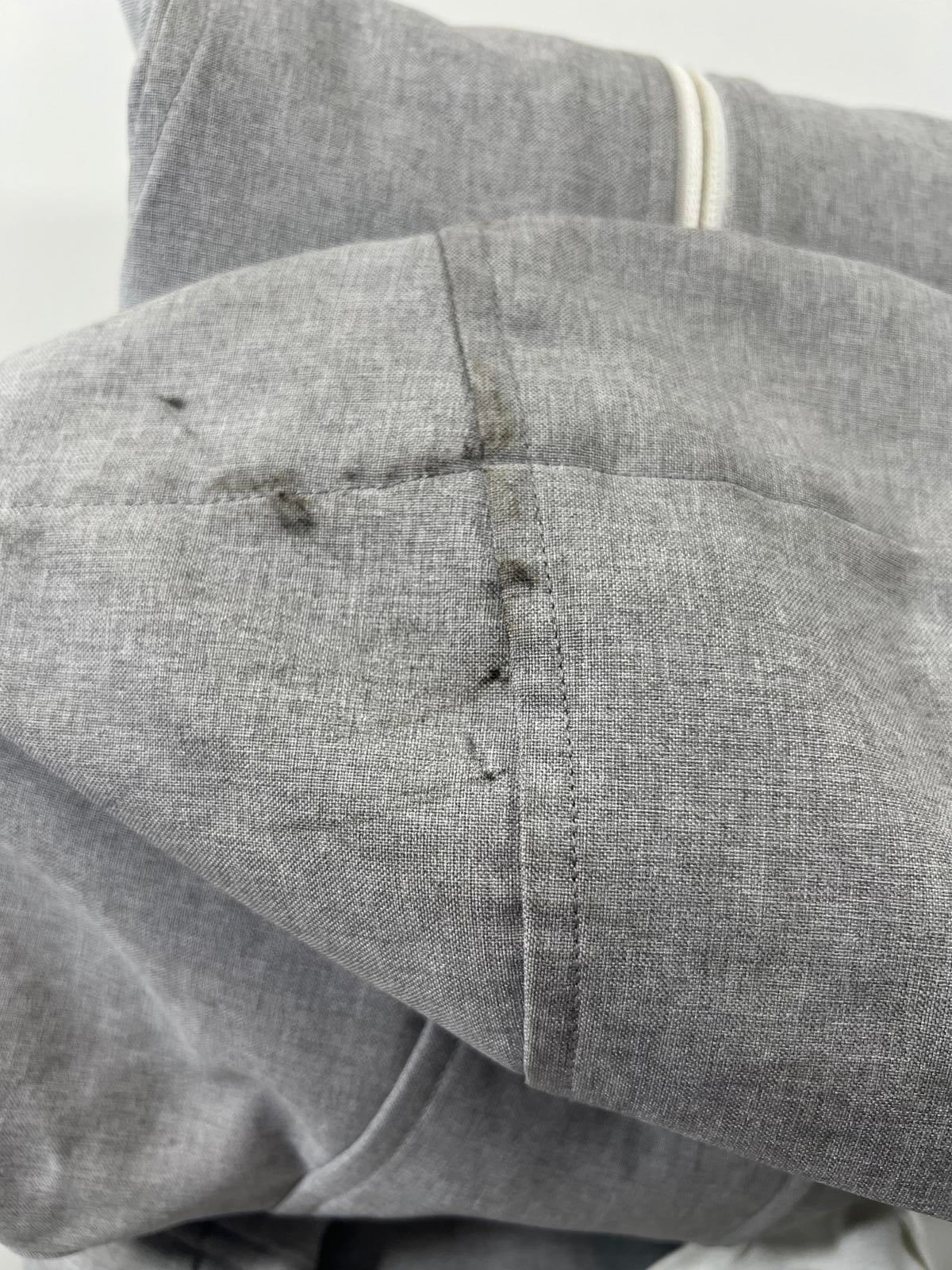 Gray softshell jacket with hood from The North Face. Features full front zipper and zippered side pockets. Made with durable outer shell material suitable for outdoor activities. Lightly used with minor stains as shown in photos. Comfortable fit with a casual style.