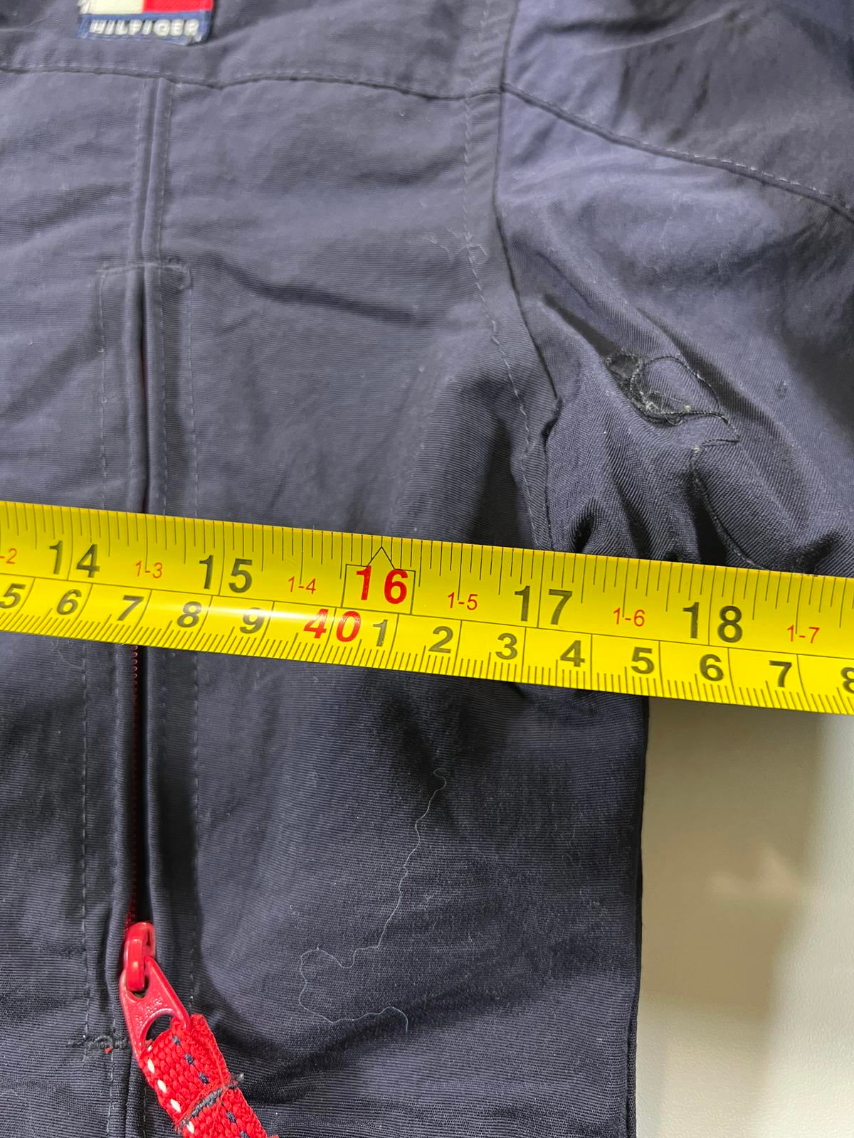 Tommy Hilfiger hooded jacket in Navy with red mesh lining. Features zippered pockets and front closure with branded detailing. Made of 100% nylon body with comfortable mesh lining. Size S/P, made in the Philippines. Ideal for casual wear and cooler weather.