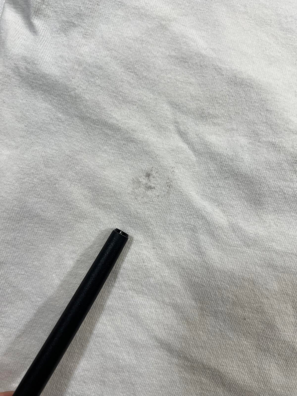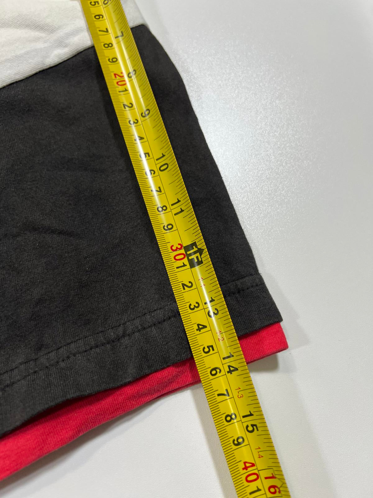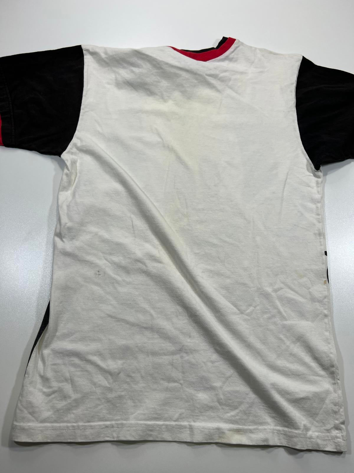 Colour-block design with black sleeves, white front, and red neckline detail.