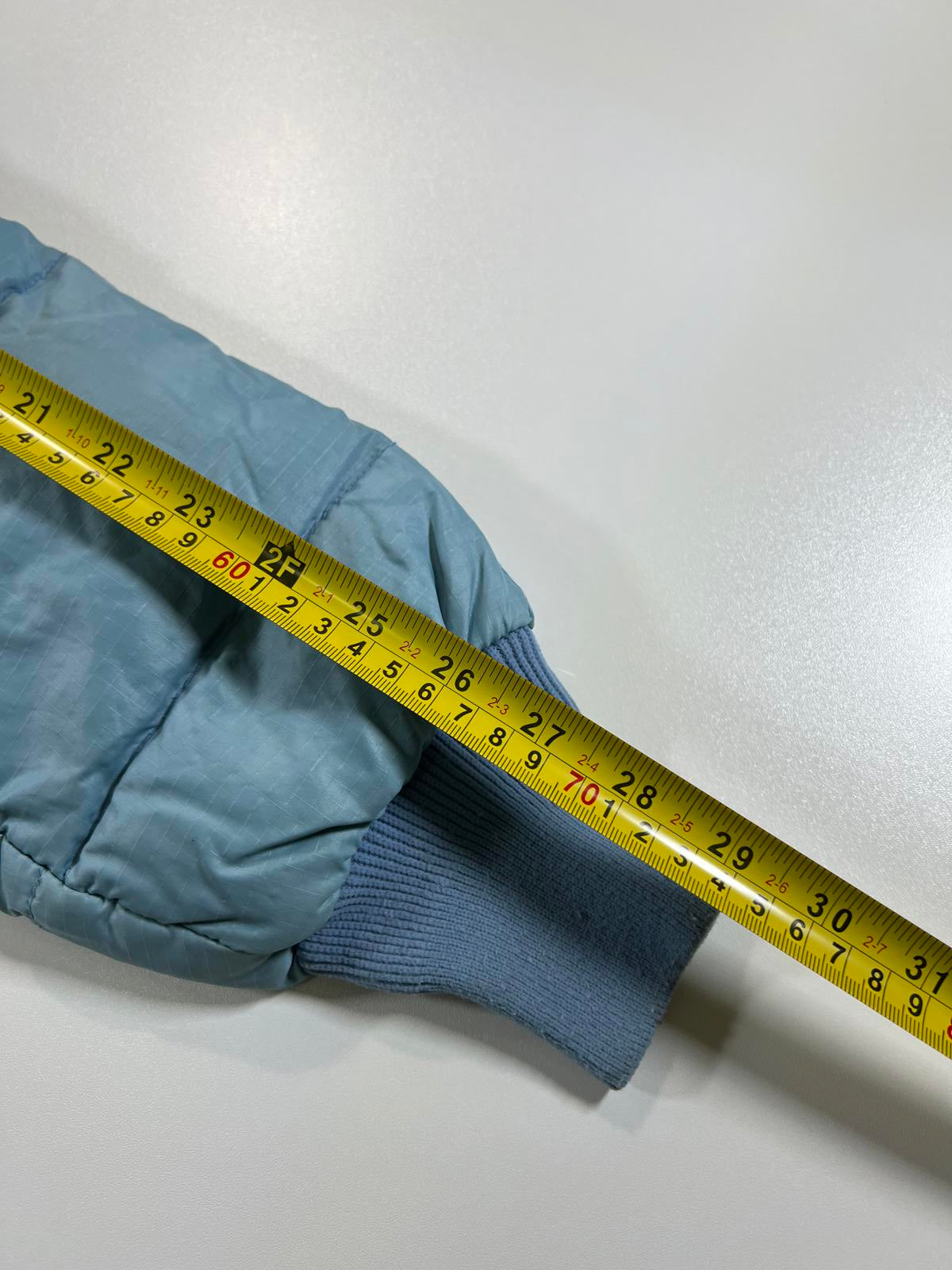 Light blue puffer jacket filled with premium quality goose down for excellent warmth. Features a front zipper closure and ribbed collar for a snug fit. Ideal for cold weather, combining comfort and lightweight insulation.