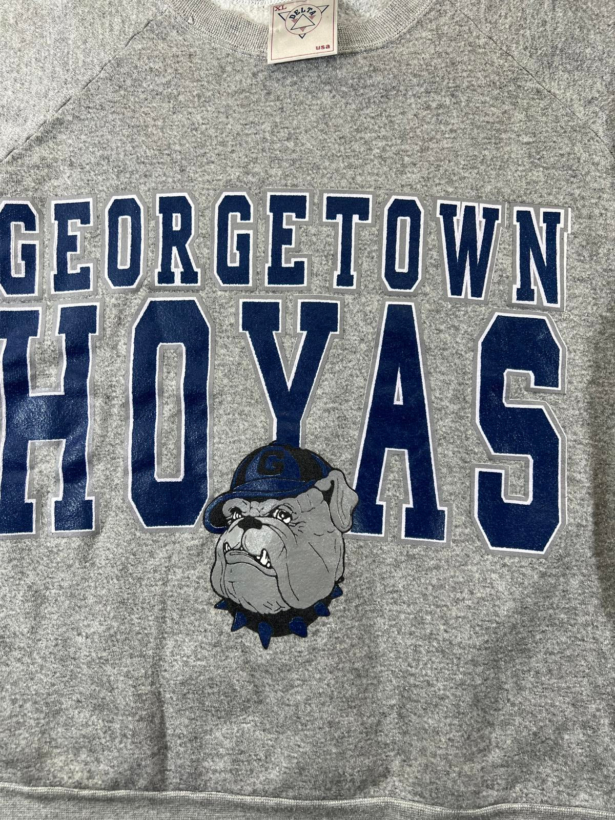 Grey crewneck sweatshirt featuring Georgetown Hoyas text and mascot graphic on the front. Made in the USA by Delta. Size XL, comfortable fit, perfect for casual wear or showing team spirit.
