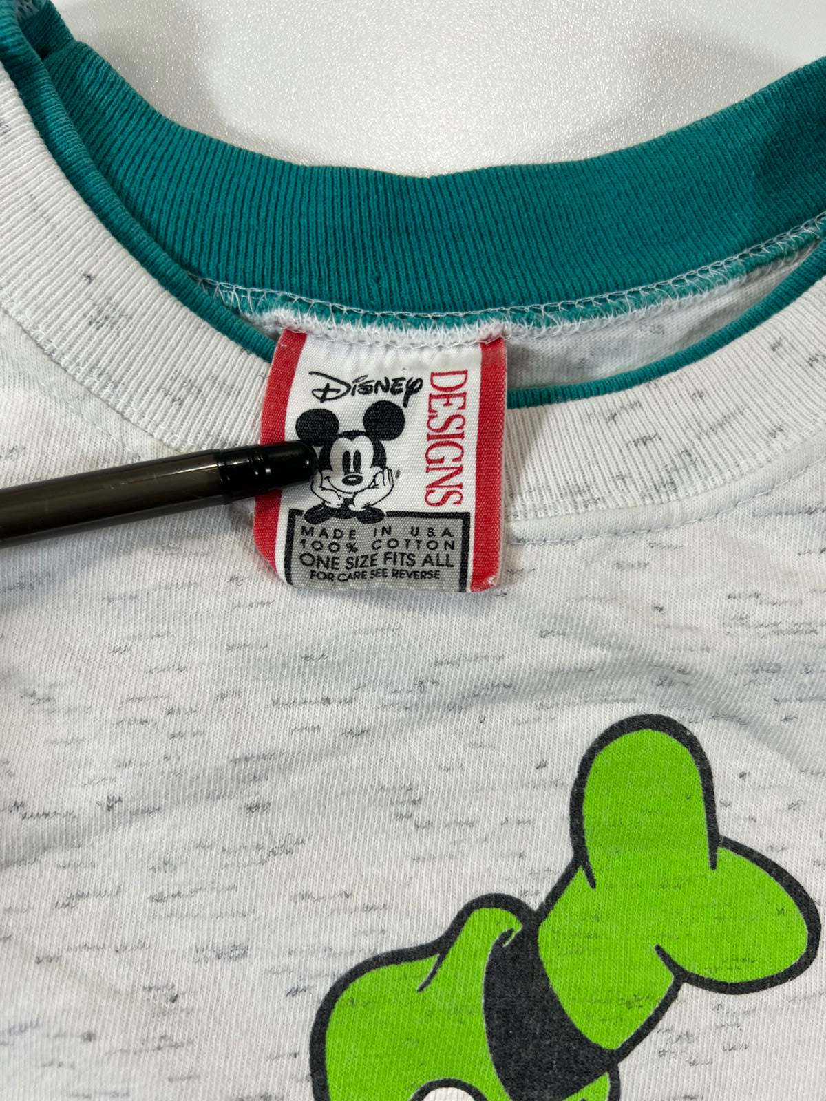 Classic vintage-style t-shirt featuring a colorful graphic of Goofy. Made from soft, comfortable fabric with a white base and subtle speckled pattern. Perfect for casual wear and Disney fans.
