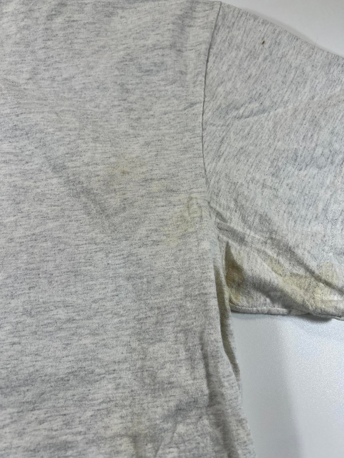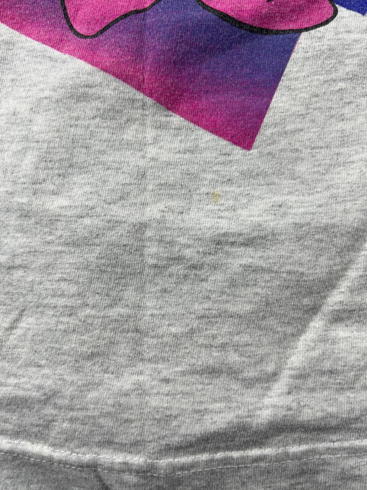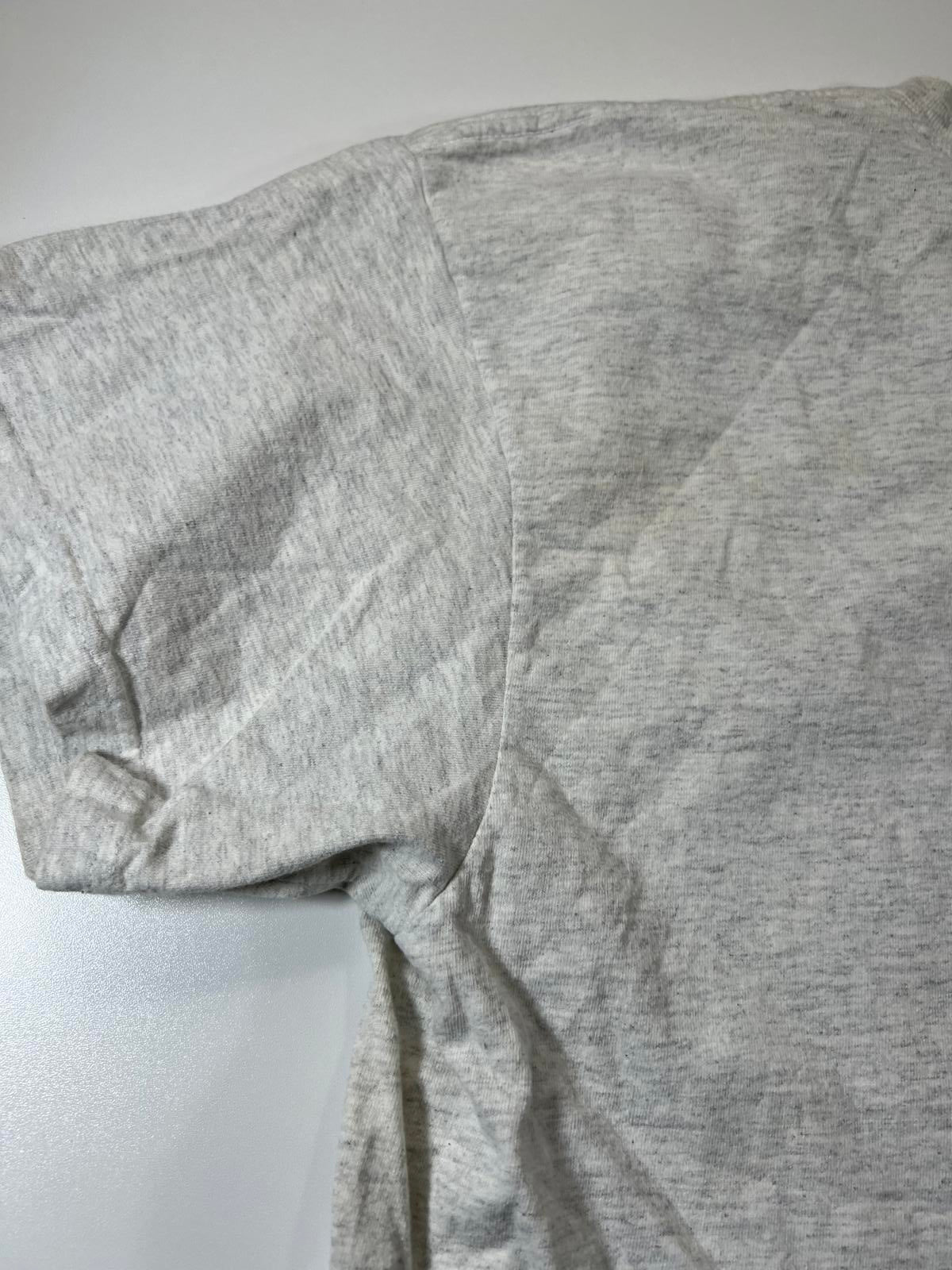 Vintage grey t-shirt featuring a colourful graphic of Mickey and Minnie Mouse with flowers and hearts. Classic crew neck and short sleeves. Soft fabric with slight signs of wear, adding to its vintage charm. Perfect for Disney fans and casual wear.