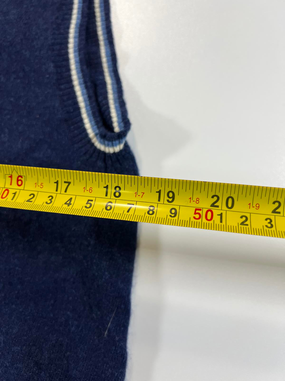 Classic Nike sleeveless sweater vest in a deep blue color. Features a V-neckline with contrasting white and light blue trim. Soft knit fabric offers comfortable wear. Perfect for layering or as a stylish standalone piece.