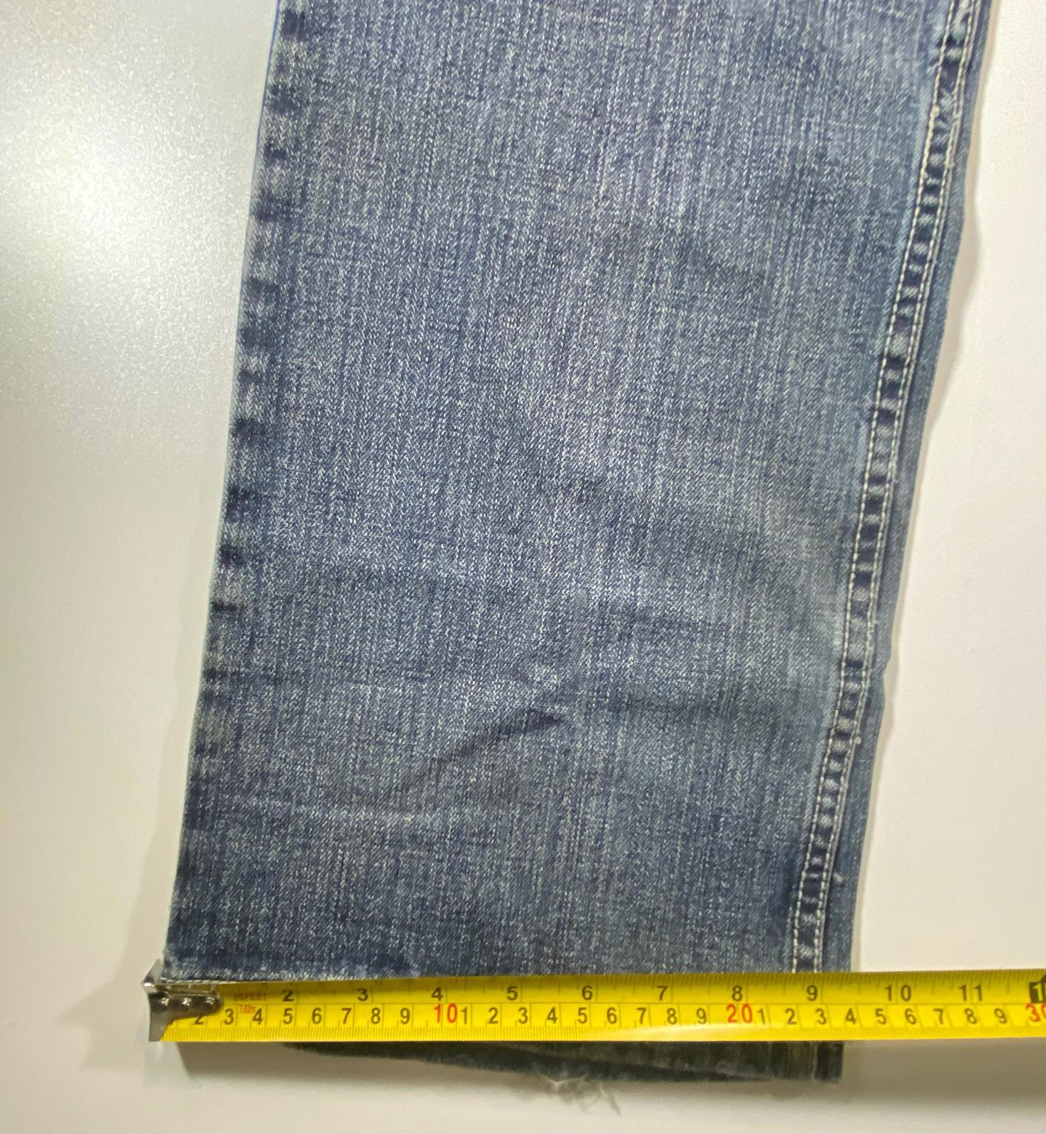Blue denim jeans from Sean John featuring embroidered details on the front pockets. Classic five-pocket design with a straight leg cut. Comfortable fit suitable for casual wear. Waist measures approximately 33 inches. Inseam measures approximately 30 inches.