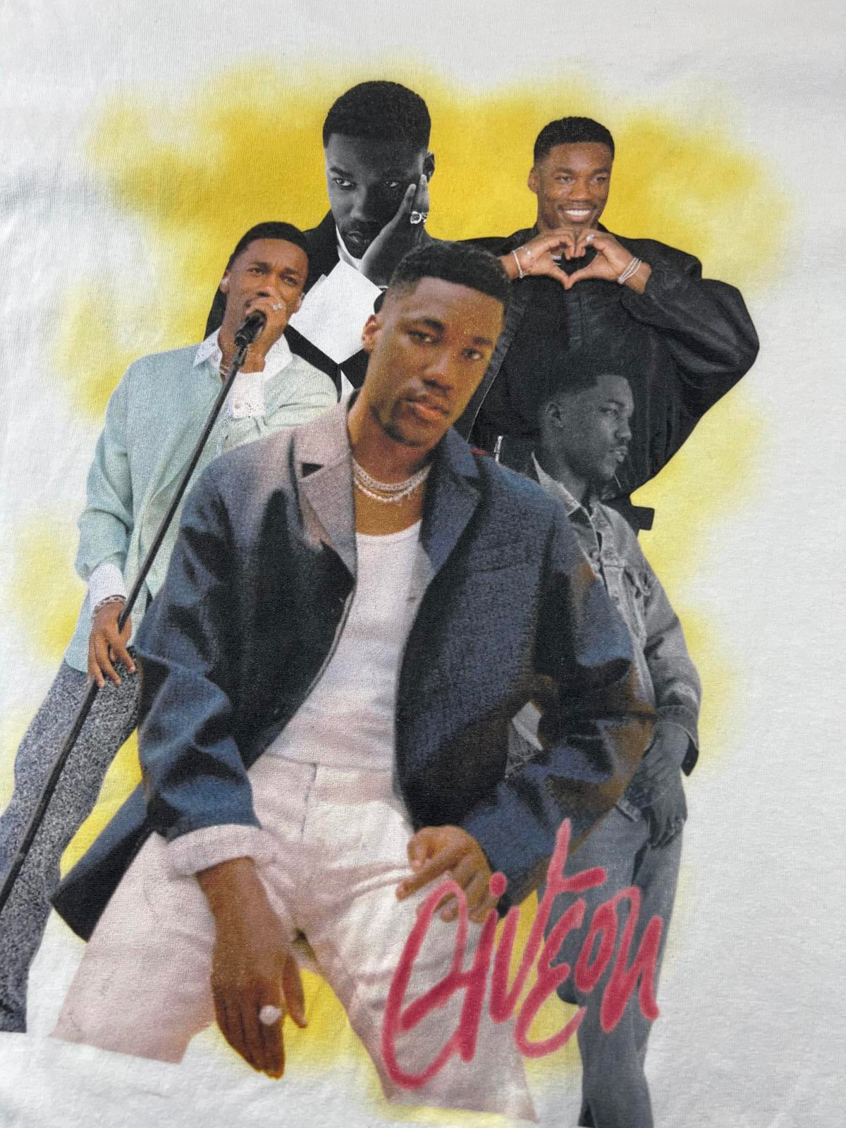 Vintage style Giveon artist tee American Apparel T-shirt featuring a vibrant multiface graphic print with yellow background accents. Made from soft, comfortable fabric. Size Large. Classic fit with crew neckline. Suitable for casual wear or as a collector's item.